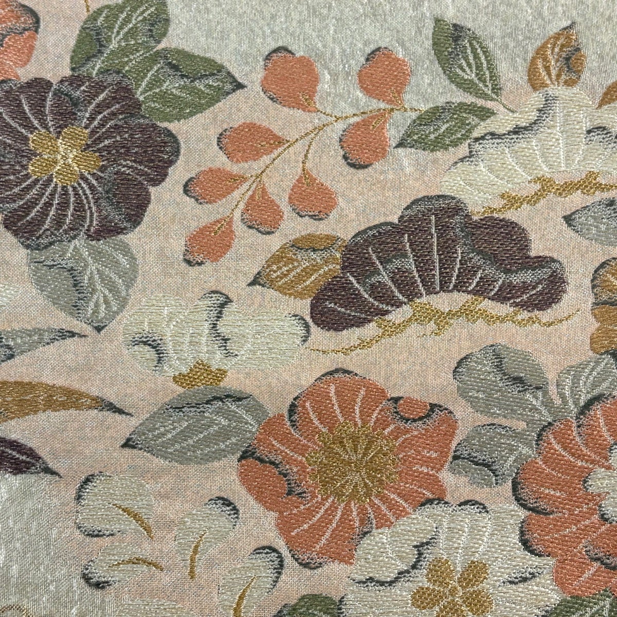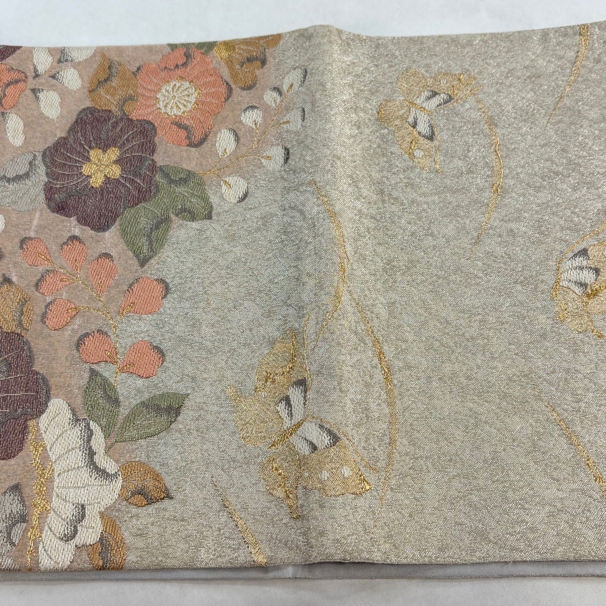 名古屋帯 優品 関西仕立て 椿 金糸 刺繍 ベージュ 正絹