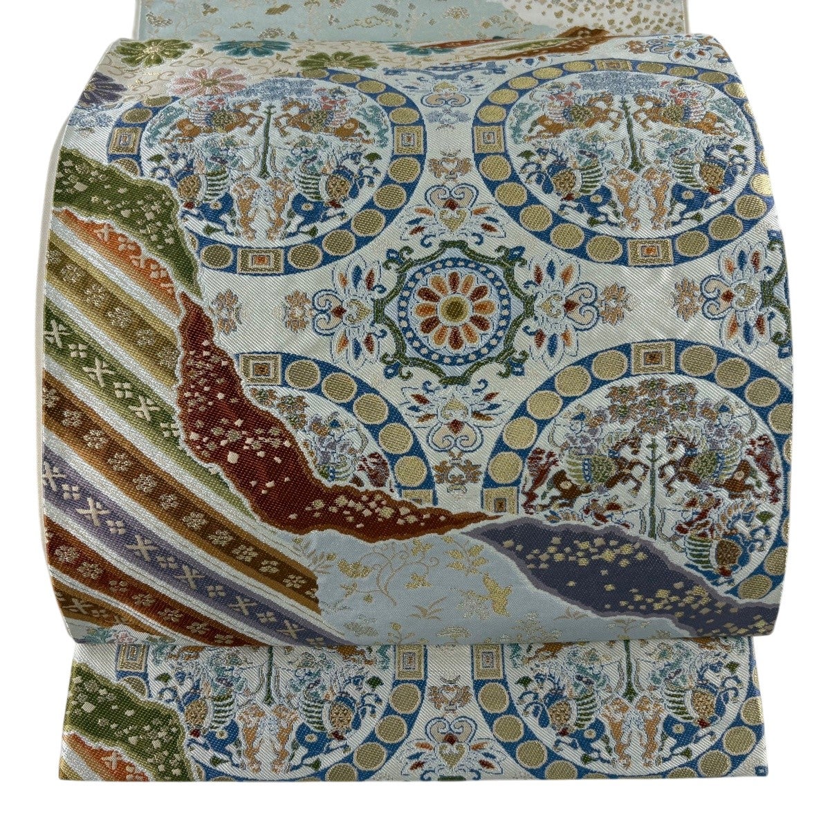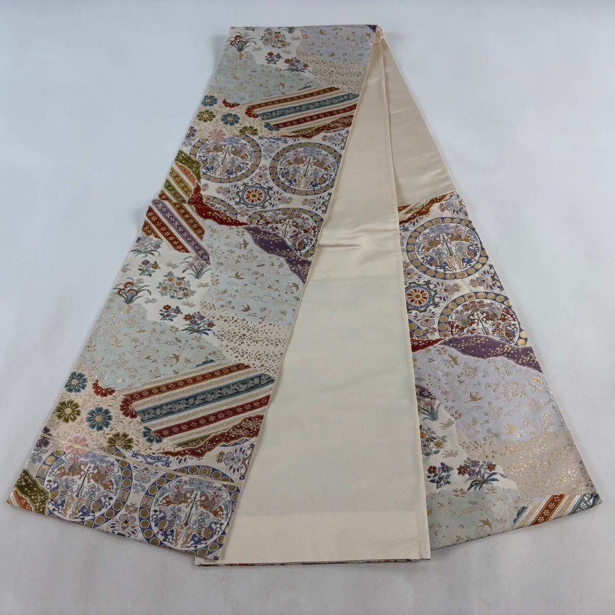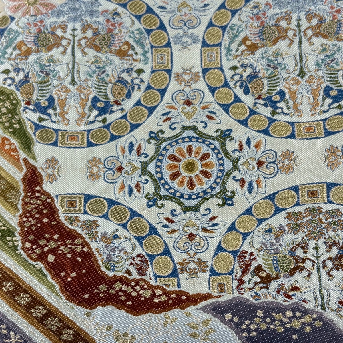 袋帯 名品 草花 丸文 金糸 クリーム お太鼓柄 正絹