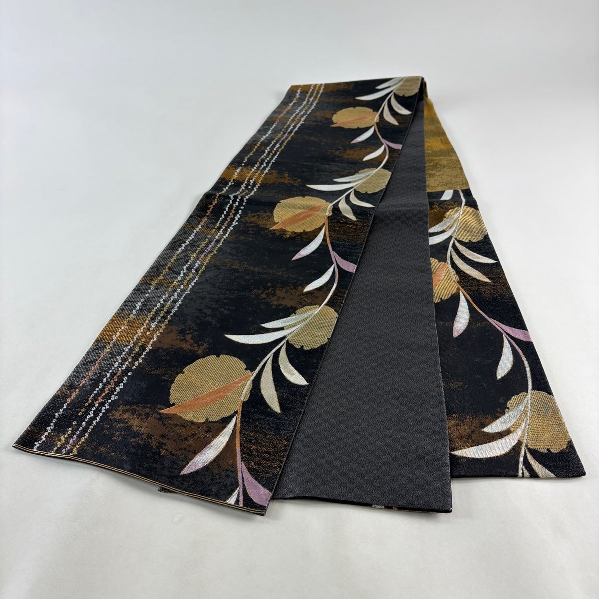 袋帯 名品 箔屋清兵衛 落款あり 草木染 幾何学 箔 灰茶 六通 正絹