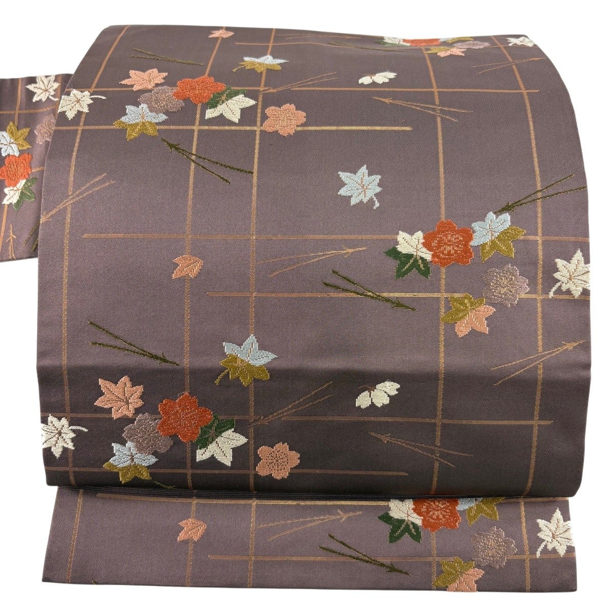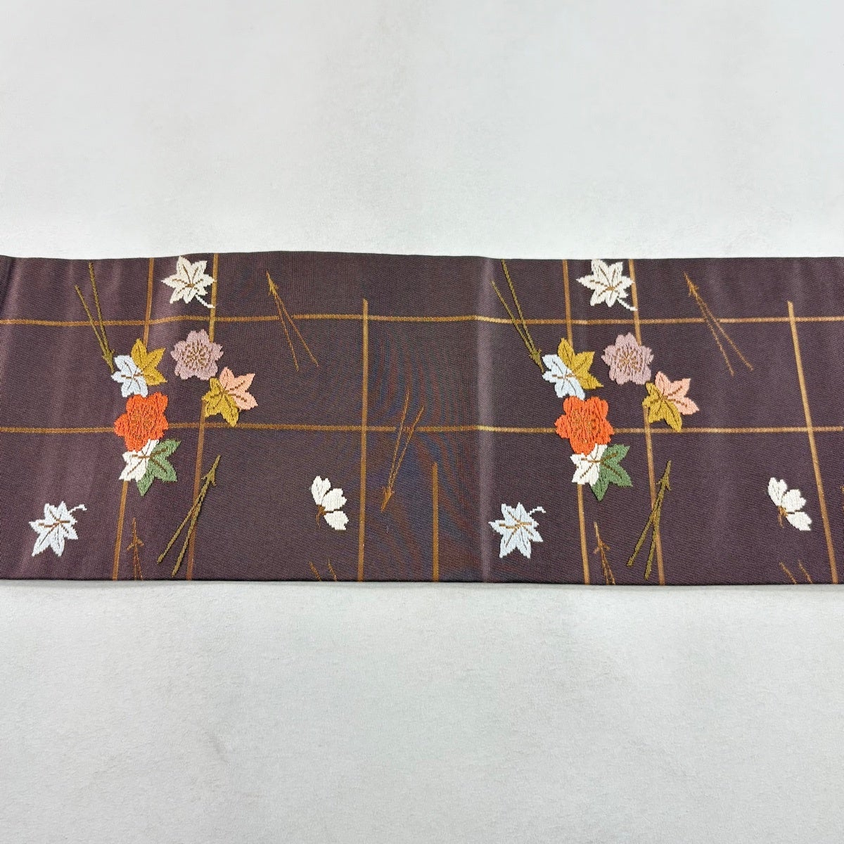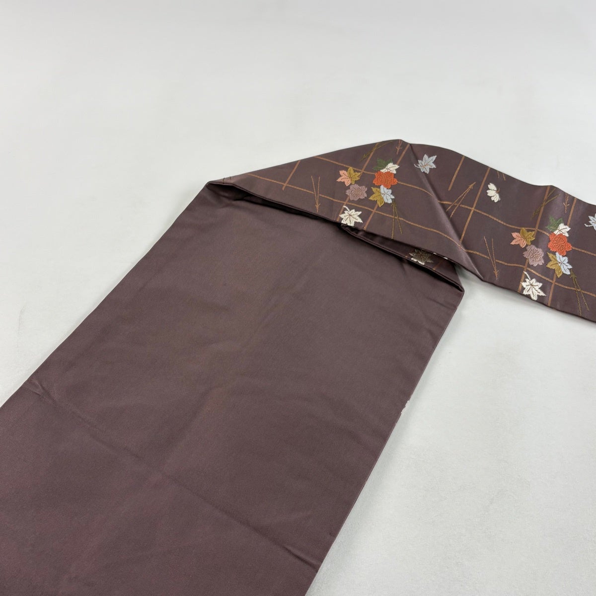 名古屋帯 優品 草花 刺繍 金糸 茜色 正絹