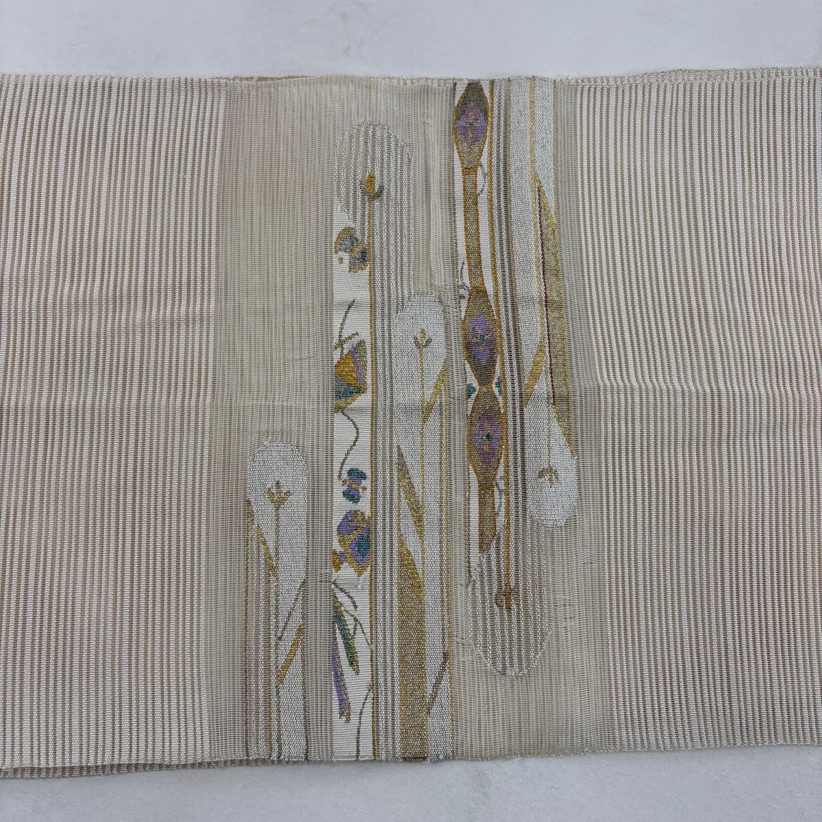 名古屋帯 優品 鳥 花 箔 ベージュ 正絹