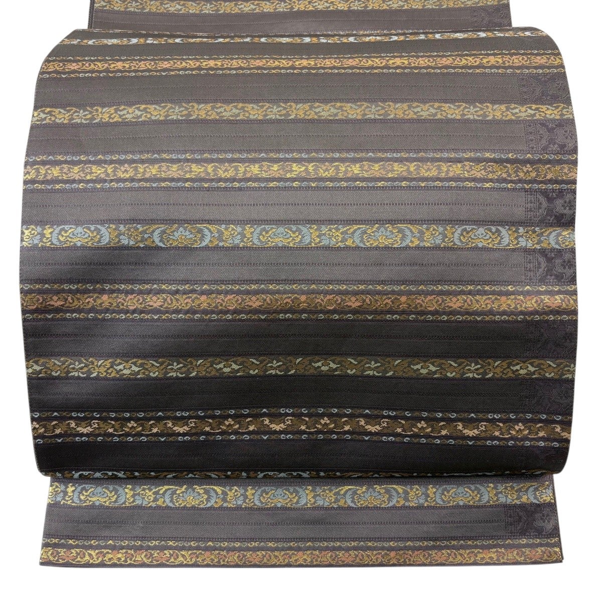 袋帯 秀品 草花 流水 刺繍 箔 青灰色 六通 正絹