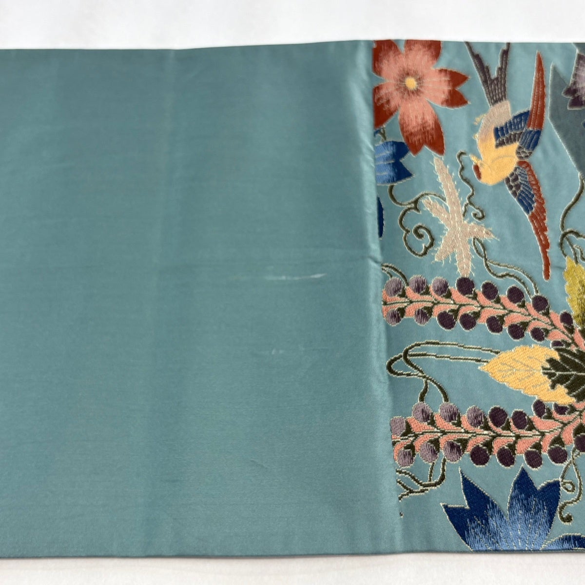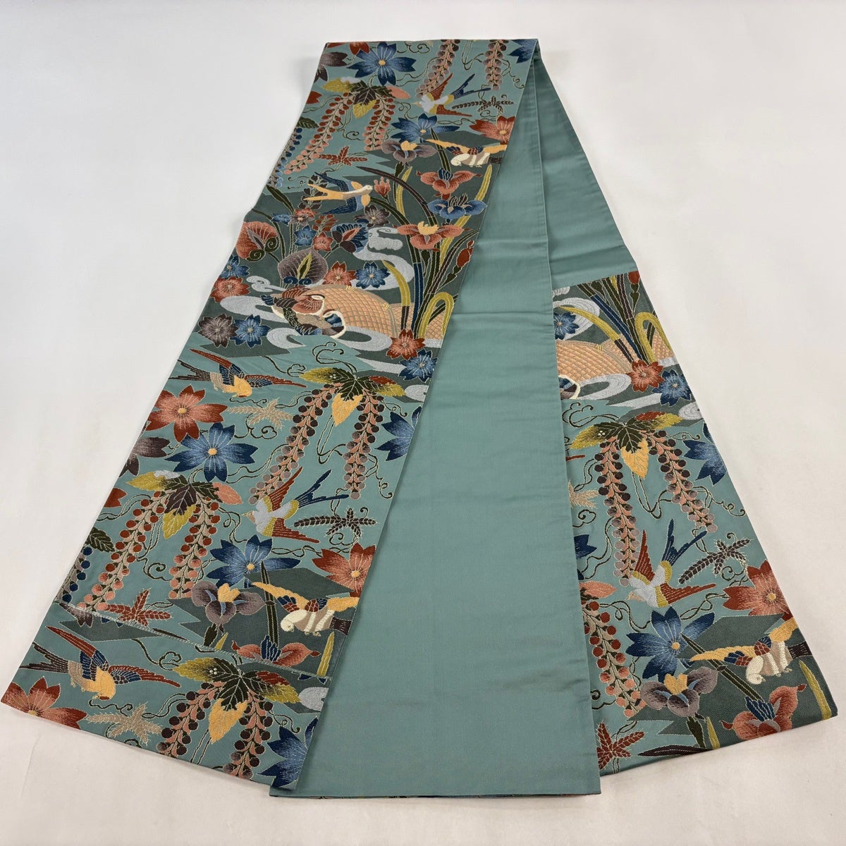 袋帯 逸品 白綾苑大庭 落款あり 鴛鴦 草花 金糸 箔 灰緑 六通 正絹