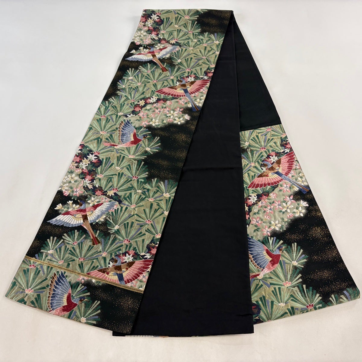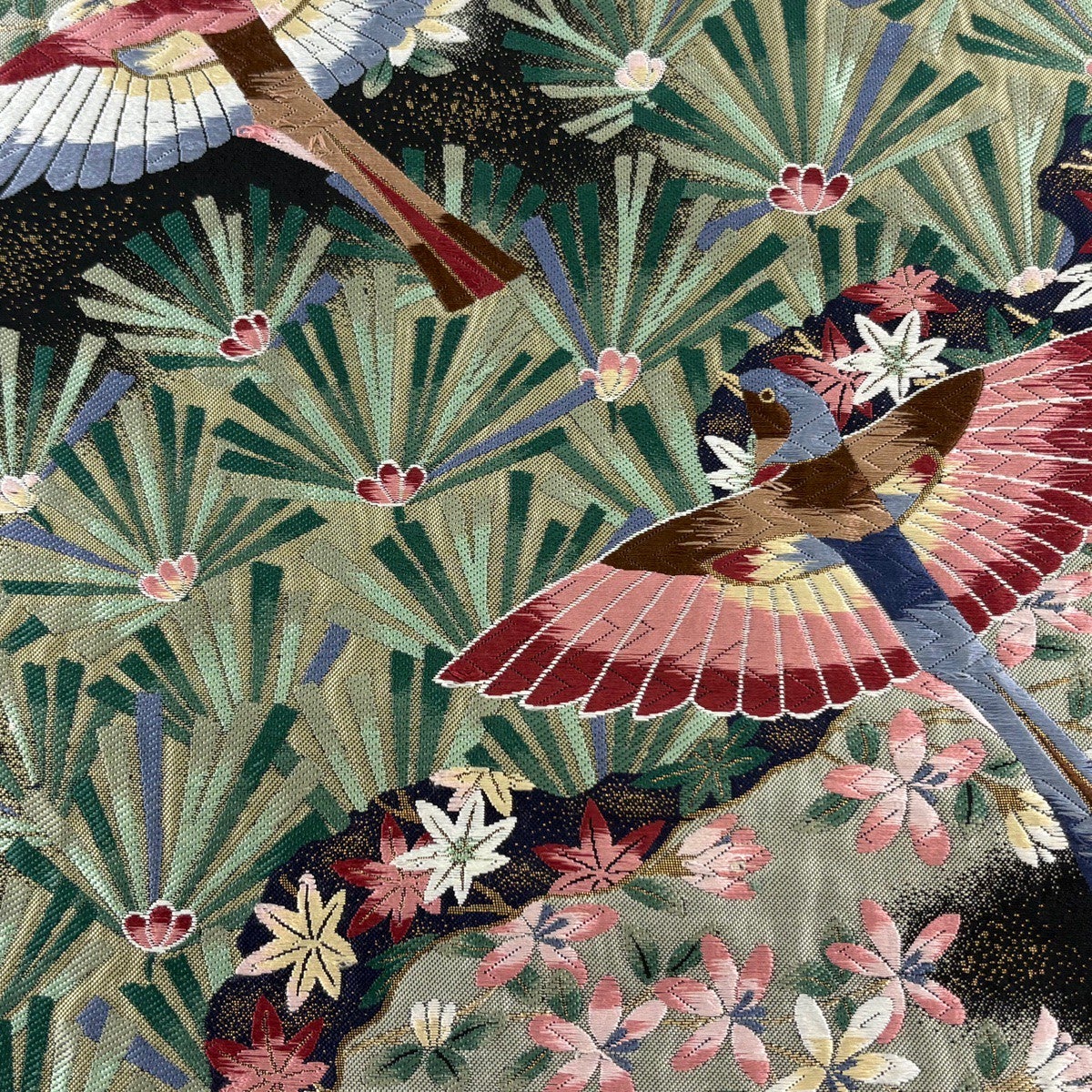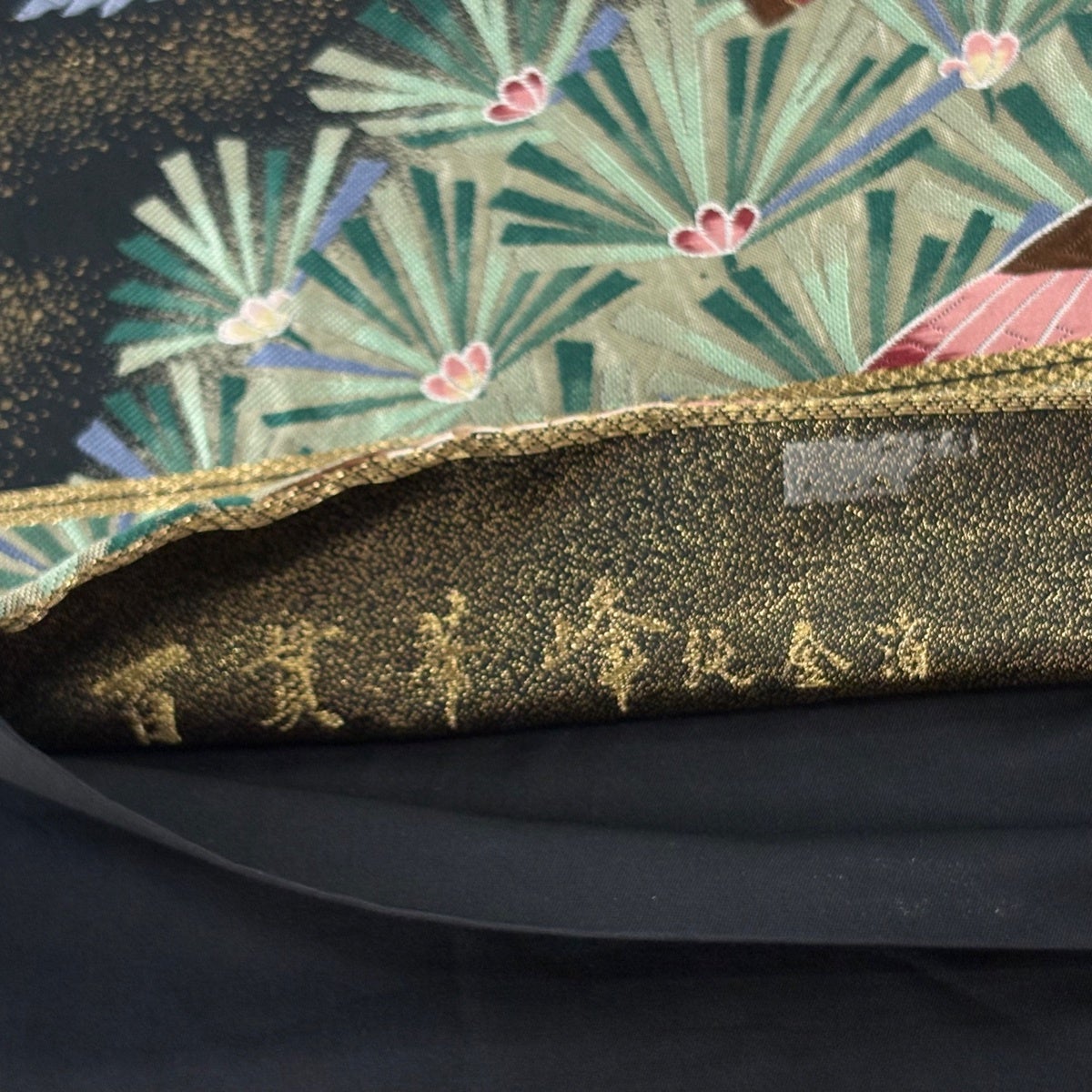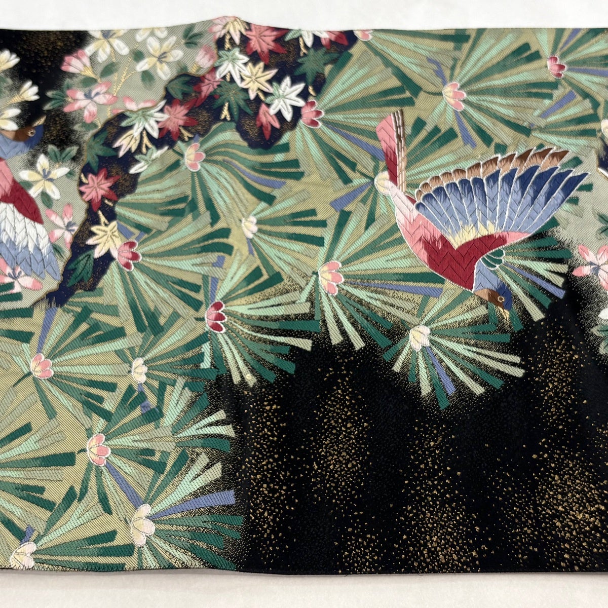 【美品】 袋帯 逸品 百貫華峰 落款あり 鳥 若松 刺繍 箔 黒 六通 正絹