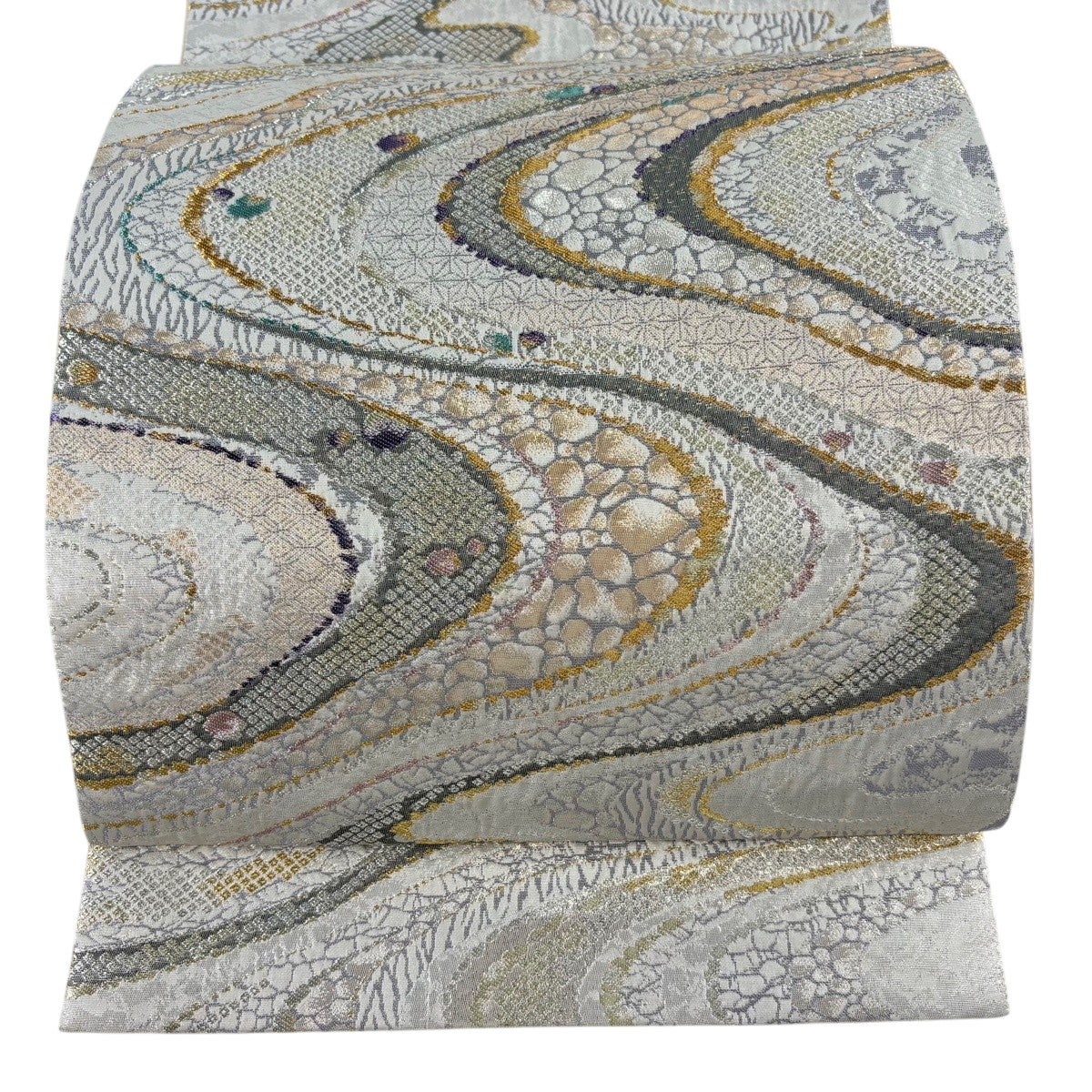 【美品】 袋帯 秀品 流水 幾何学模様 金銀糸 箔 灰紫 六通 正絹
