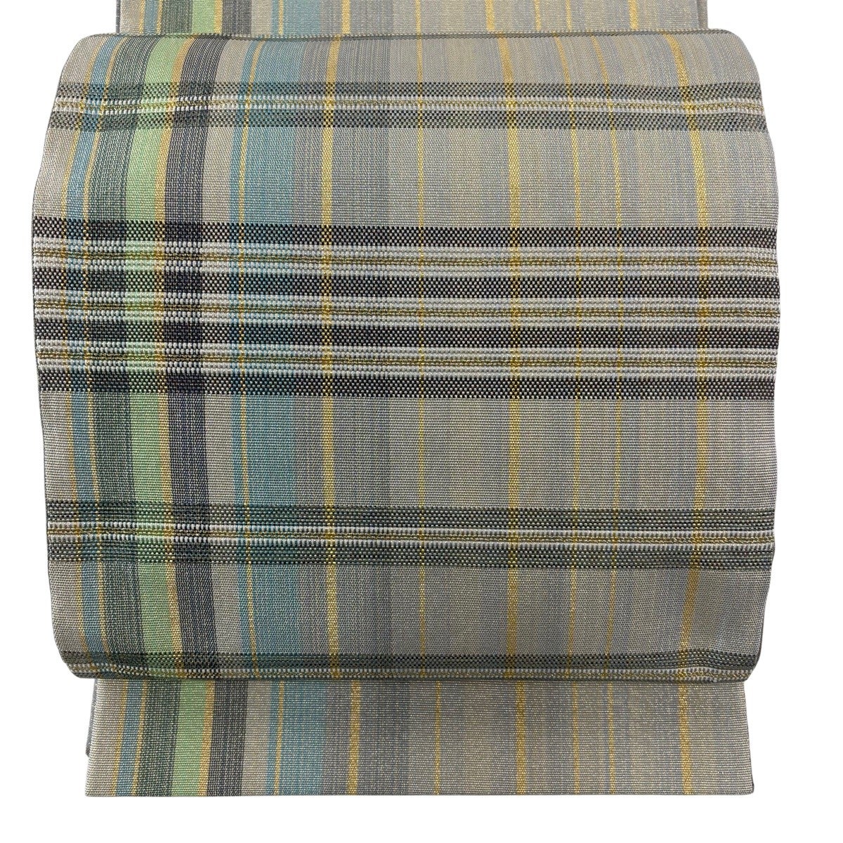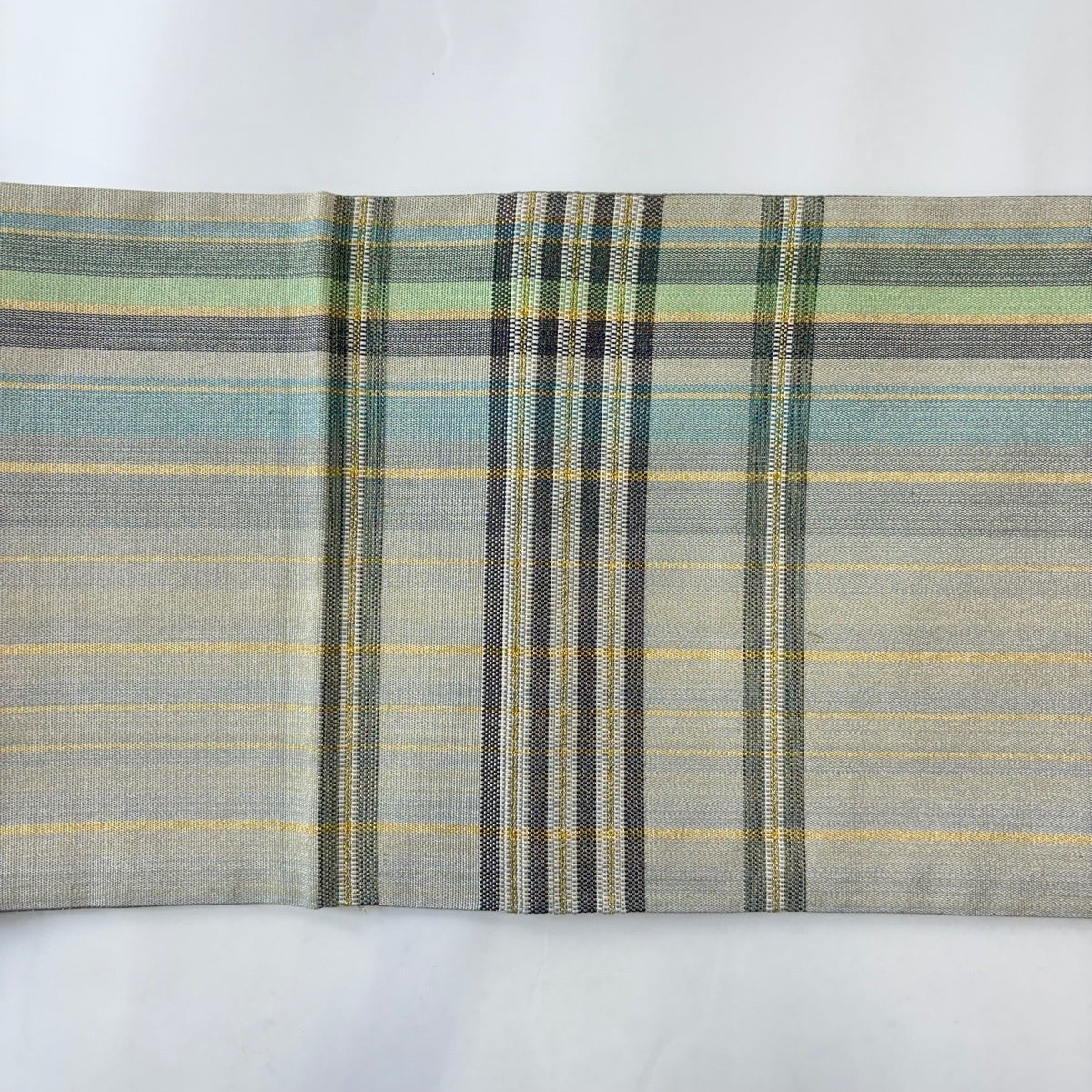 【美品】 袋帯 秀品 縞 金糸 灰緑 お太鼓柄 正絹