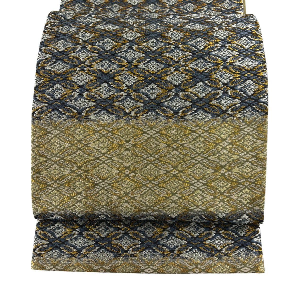 【美品】 袋帯 名品 紬地 菱文 唐草 箔 深緑 六通 正絹