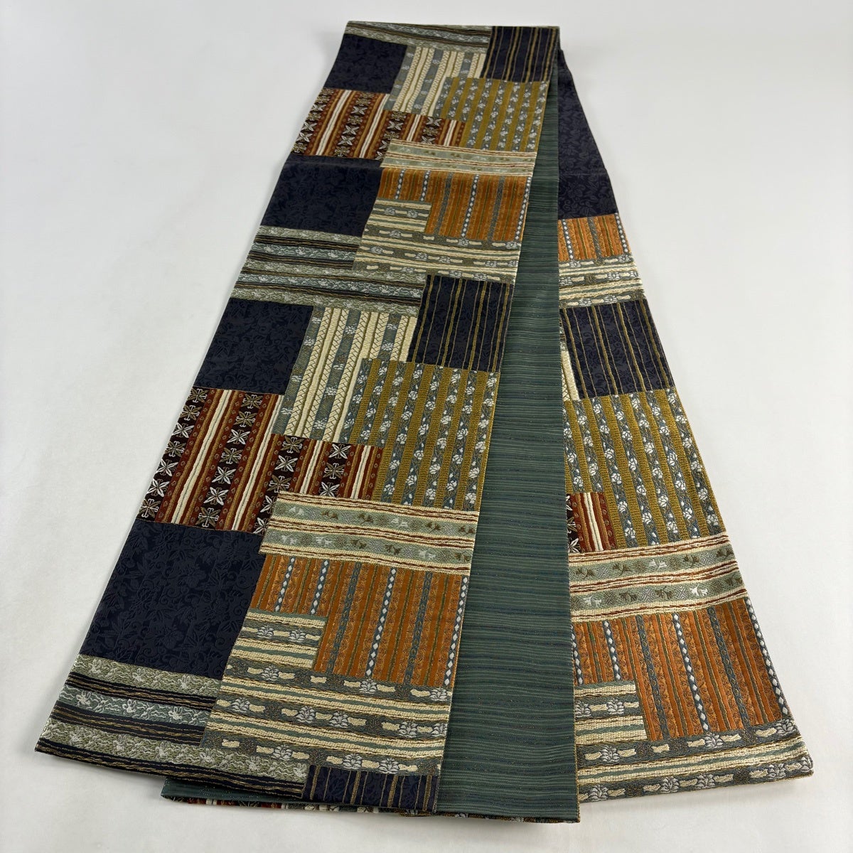 【美品】 袋帯 秀品 市松 段縞 金糸 箔 茶紫 六通 正絹