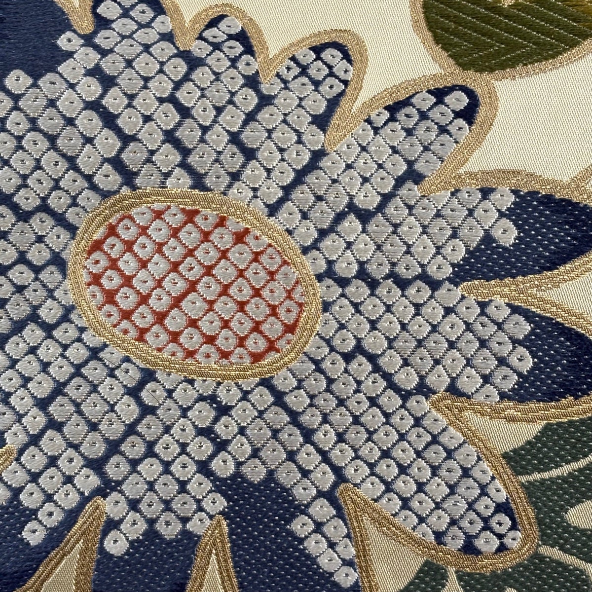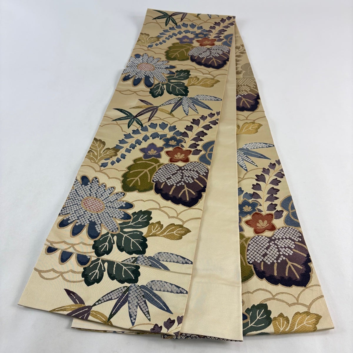 【美品】 袋帯 名品 やまと 雪輪青海波 花 金糸 クリーム 六通 正絹