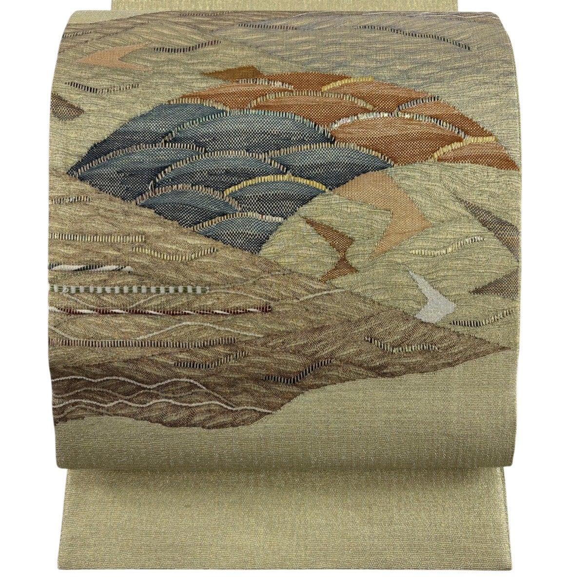【美品】 袋帯 秀品 段縞 幾何学模様 箔 茶緑色 全通 正絹