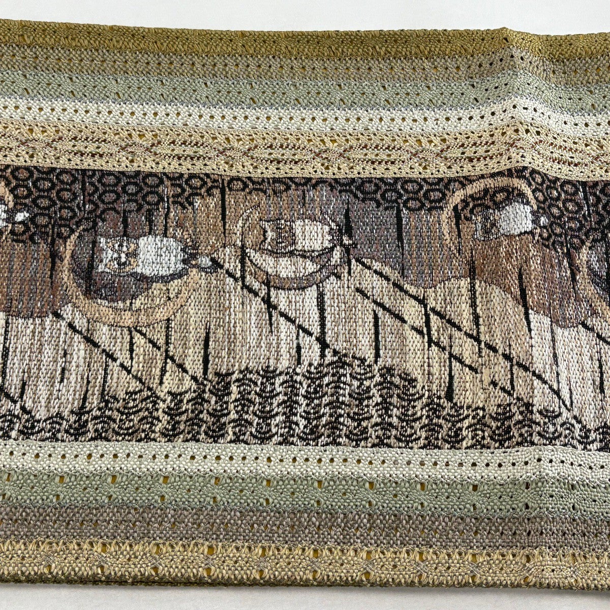 【美品】 袋帯 逸品 落款あり 上島洋山 能州紬 幾何学 縞 金銀糸 ベージュ お太鼓柄 正絹
