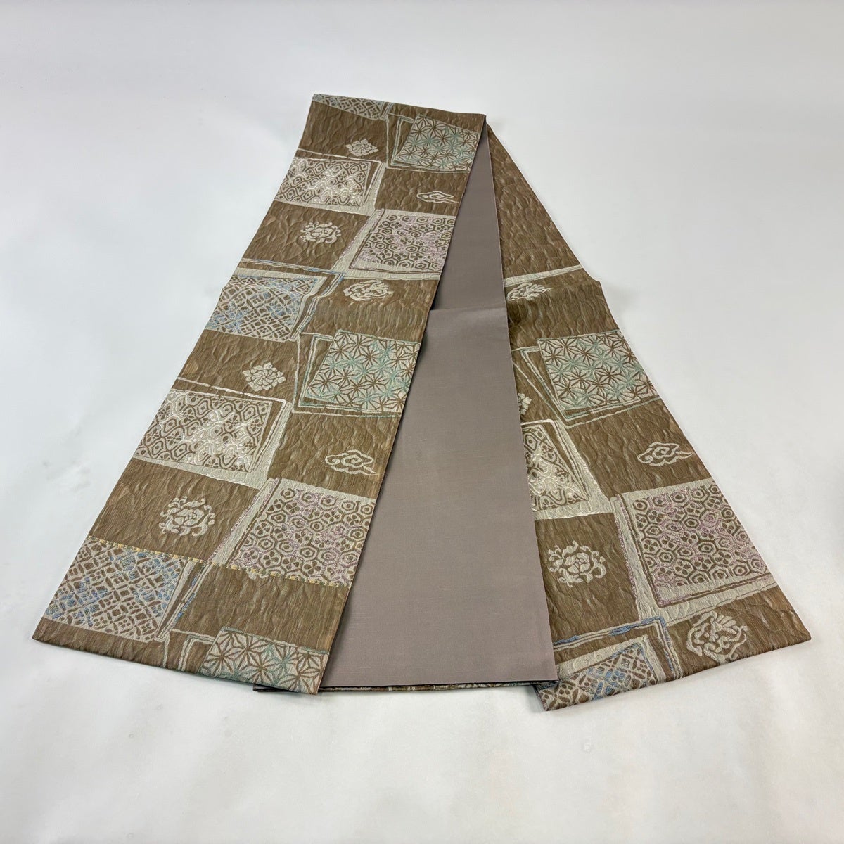 【美品】 名古屋帯 秀品 幾何学模様 金糸 茶紫 正絹