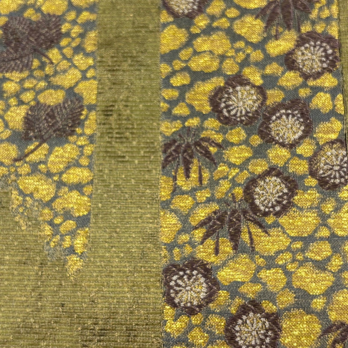 【美品】 袋帯 秀品 段縞 草花 箔 螺鈿 深緑 お太鼓柄 正絹