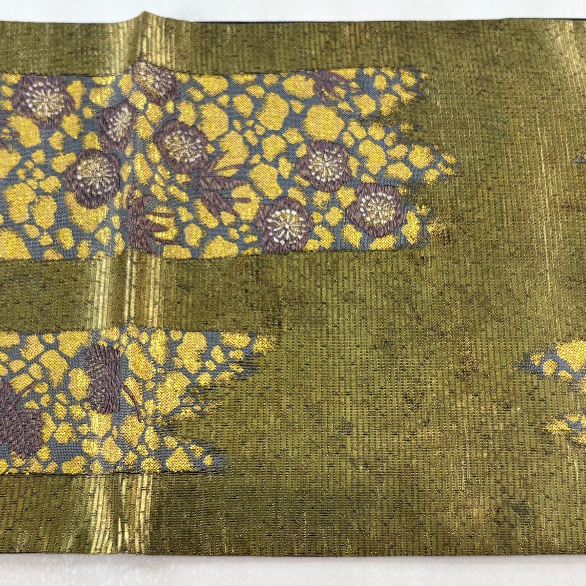 【美品】 袋帯 秀品 落款あり 草花 鳥 箔 鶯色 六通 正絹