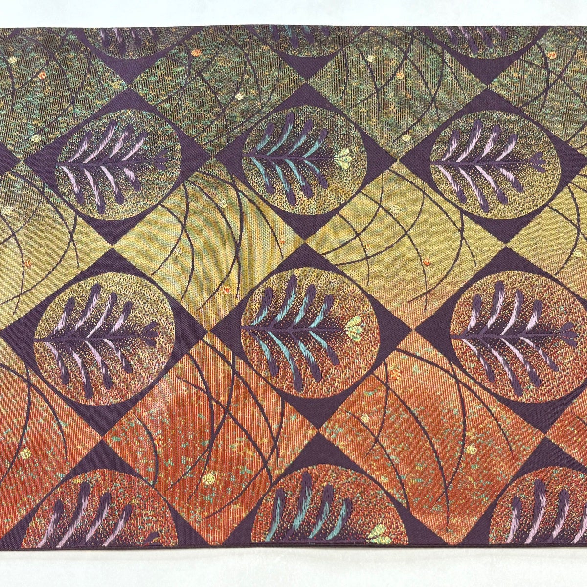 【美品】 袋帯 名品 七宝尽くし円想 羽衣織 幾何学模様 葉柄 金銀糸 箔 灰紫 お太鼓柄 正絹