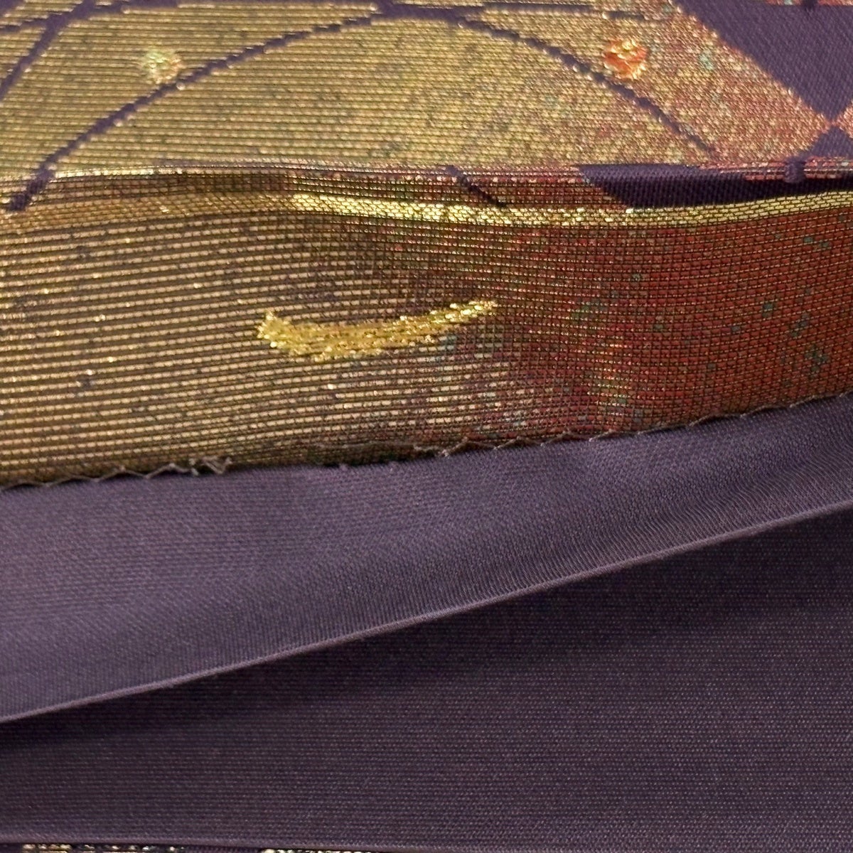 【美品】 袋帯 秀品 縞 幾何学 箔 茶紫 お太鼓柄 正絹