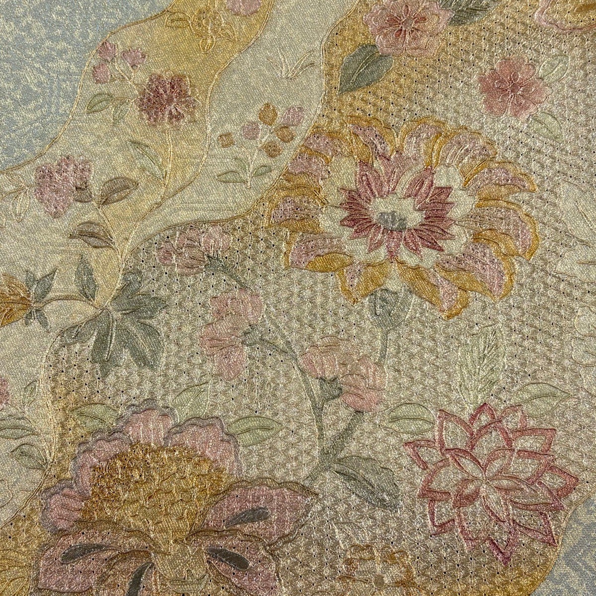 【美品】 袋名古屋帯 秀品 鳥丸文 花丸文 金糸 箔 ベージュ 正絹