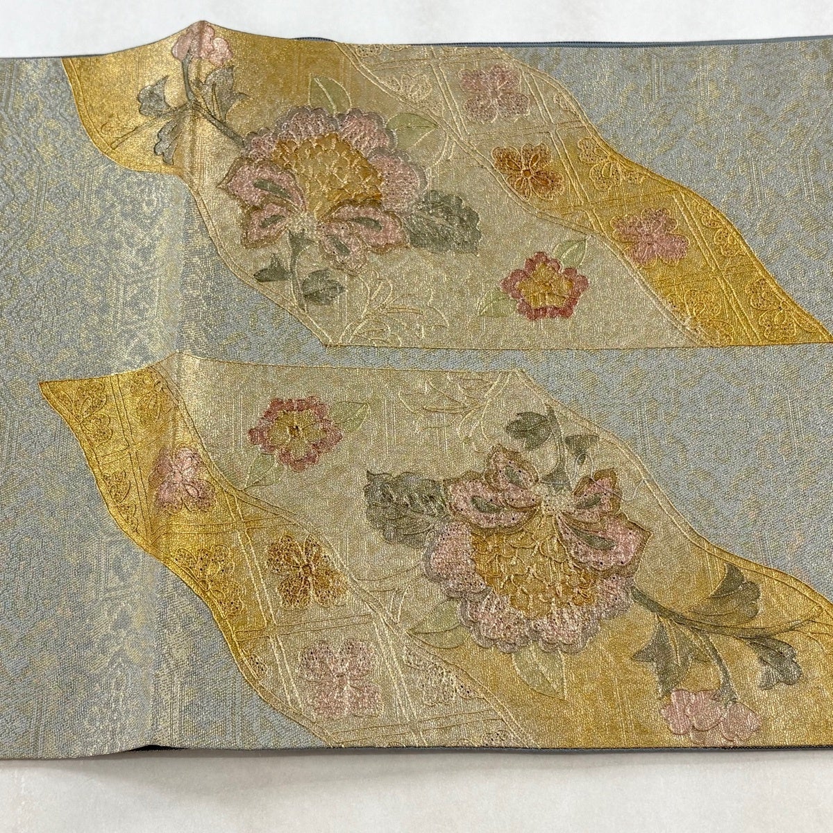 【美品】 袋帯 名品 草花 蜀江文 刺繍 金銀彩 灰緑 お太鼓柄 正絹