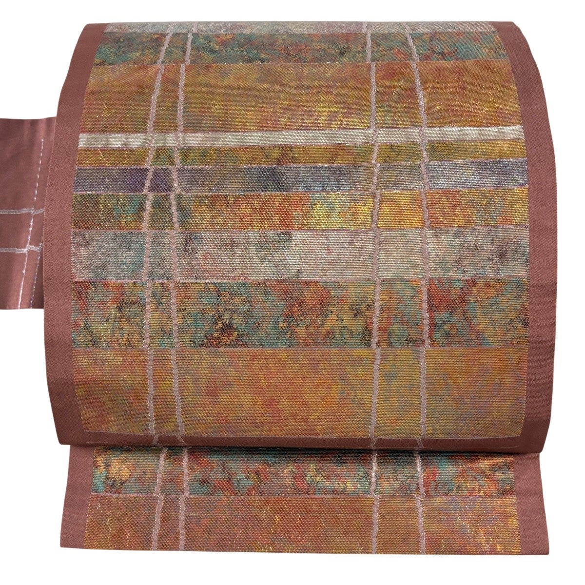 袋帯 秀品 花唐草 斜縞 箔 赤茶 六通 正絹
