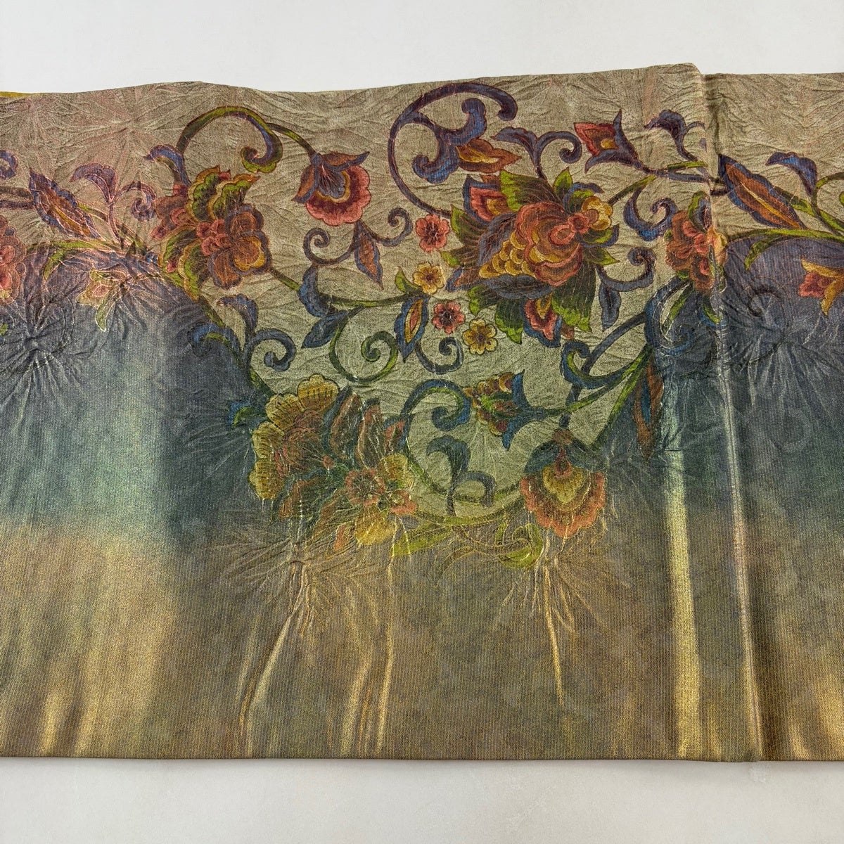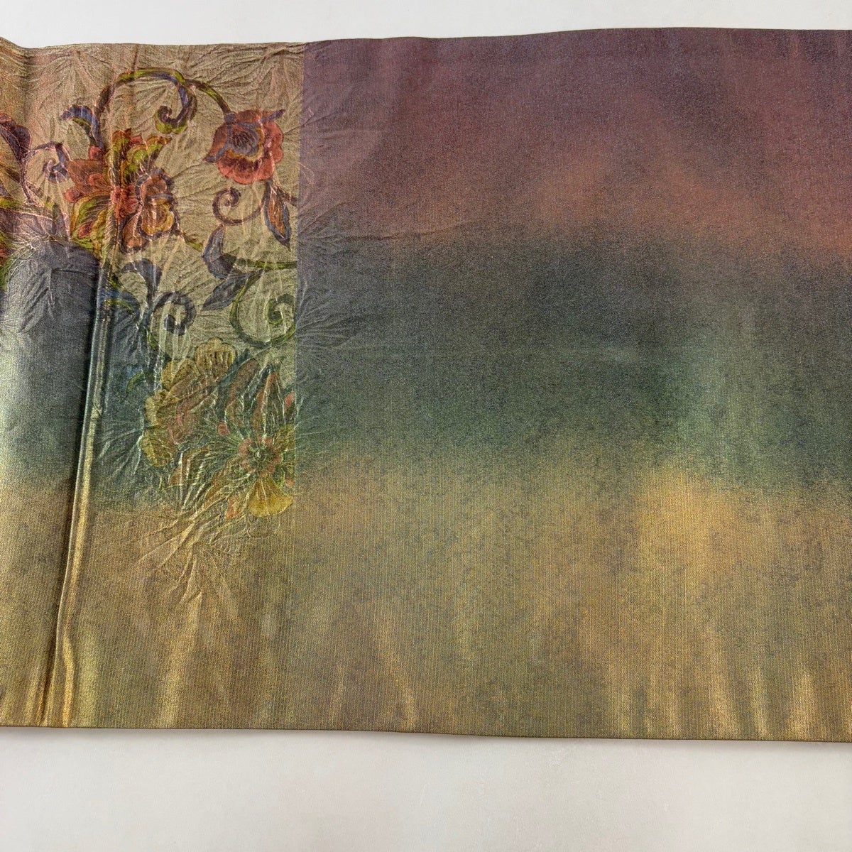 【美品】 袋帯 秀品 草花 幾何学模様 箔 灰茶 六通 正絹