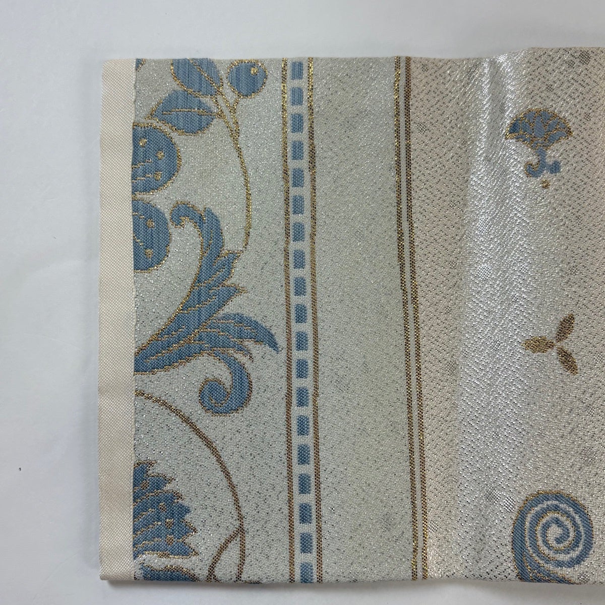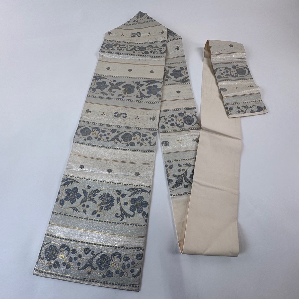 名古屋帯 秀品 八寸名古屋帯 松葉仕立て 花唐草 縞 刺繍 灰色 正絹