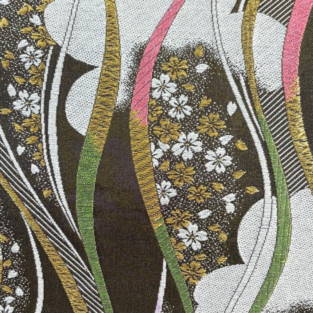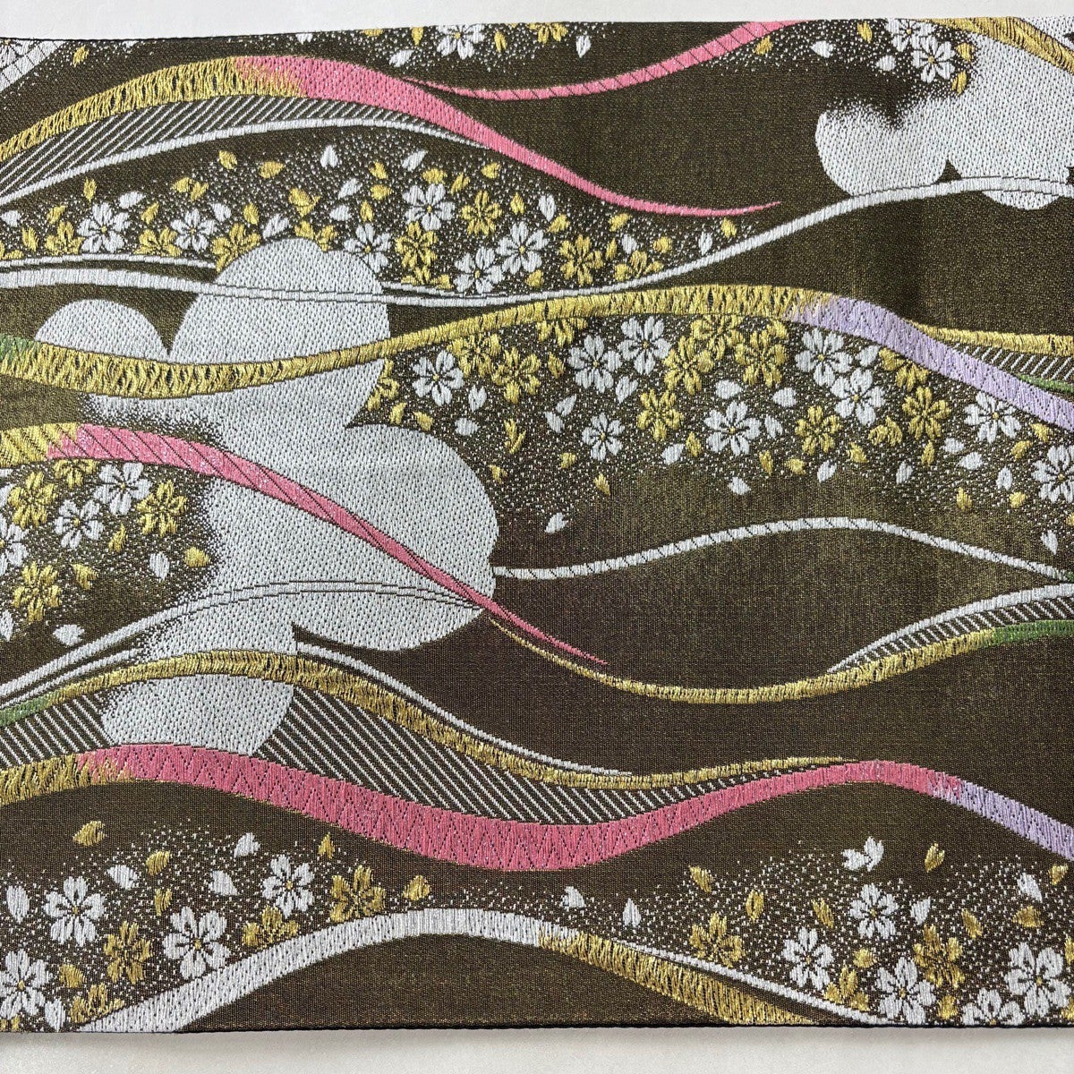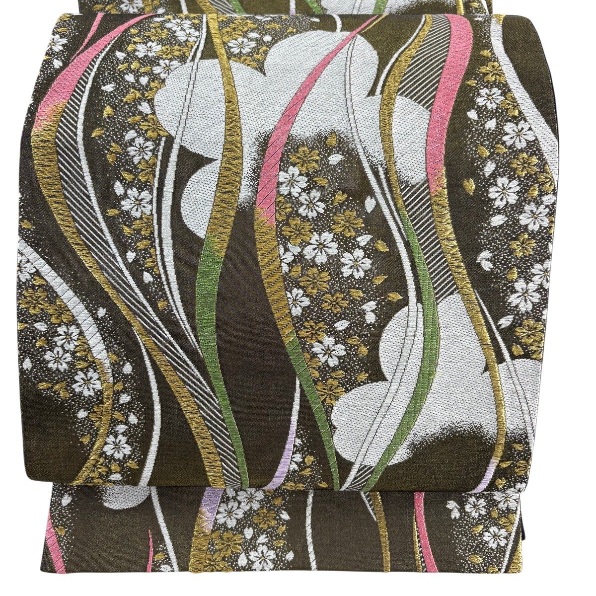 袋帯 秀品 鈴乃屋 よろけ縞 桜 金糸 箔 茶緑色 六通 正絹