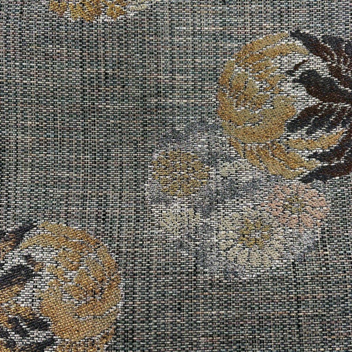 【美品】 袋帯 逸品 落款あり 牛首紬地 草花 幾何学 金銀彩 茶緑色 全通 正絹
