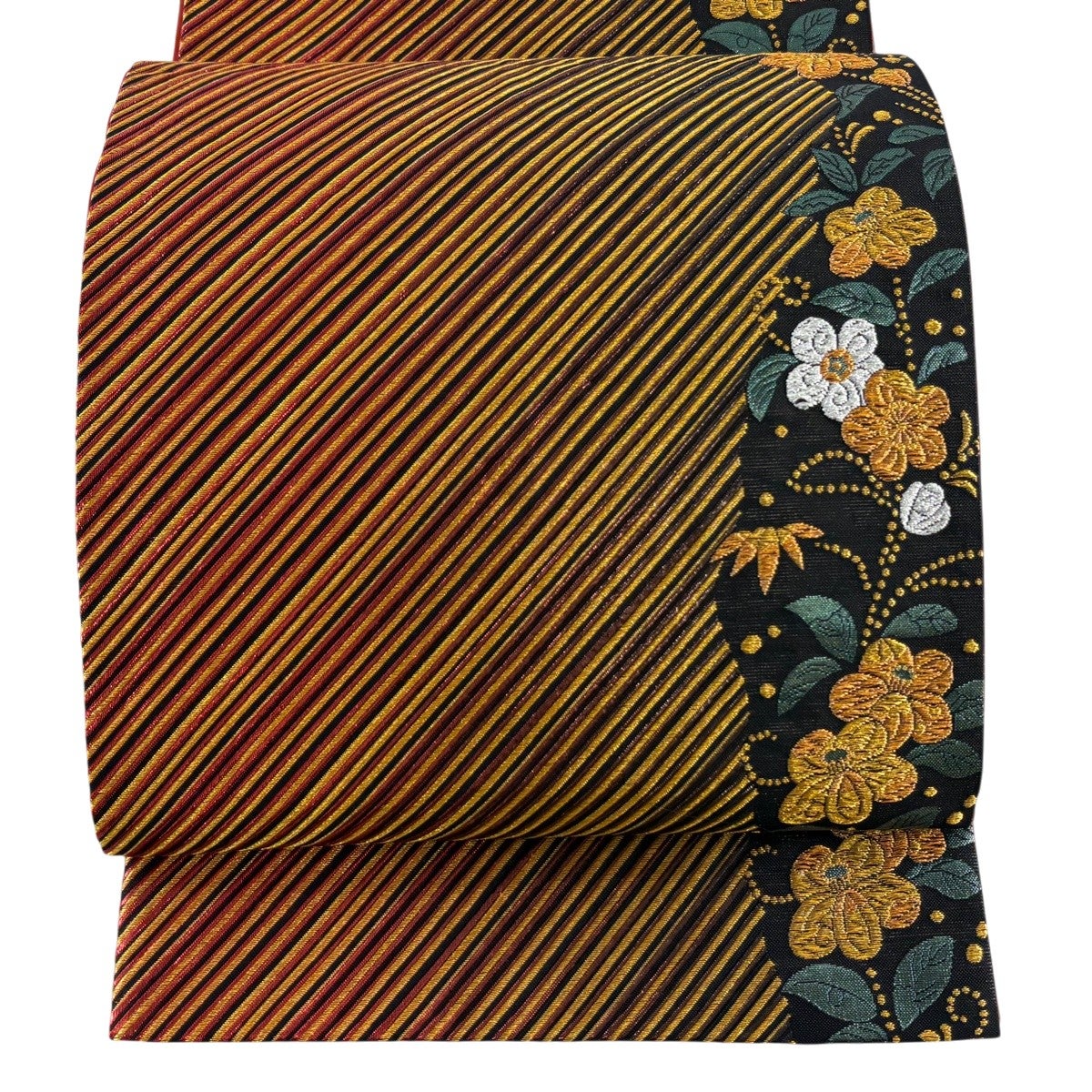 【美品】 袋帯 秀品 草花 斜縞 金銀糸 箔 黒 六通 正絹