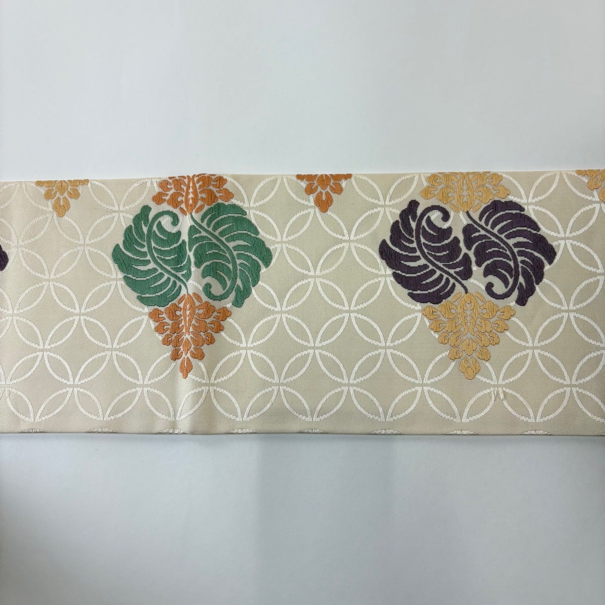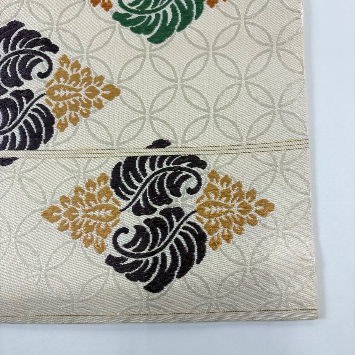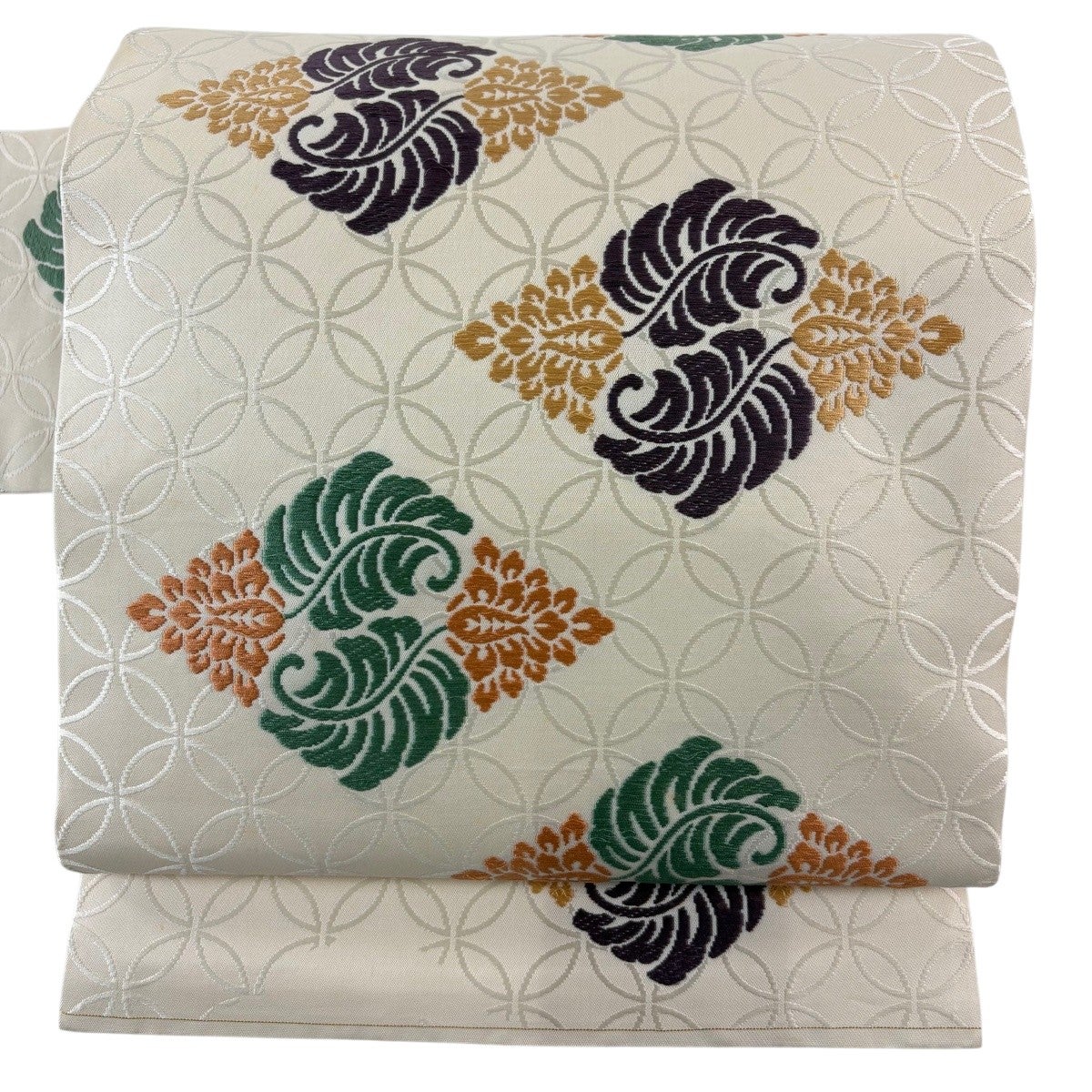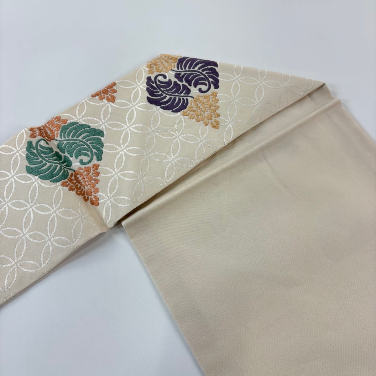 名古屋帯 逸品 関西仕立て 菱 草花 刺繍 ベージュ 正絹