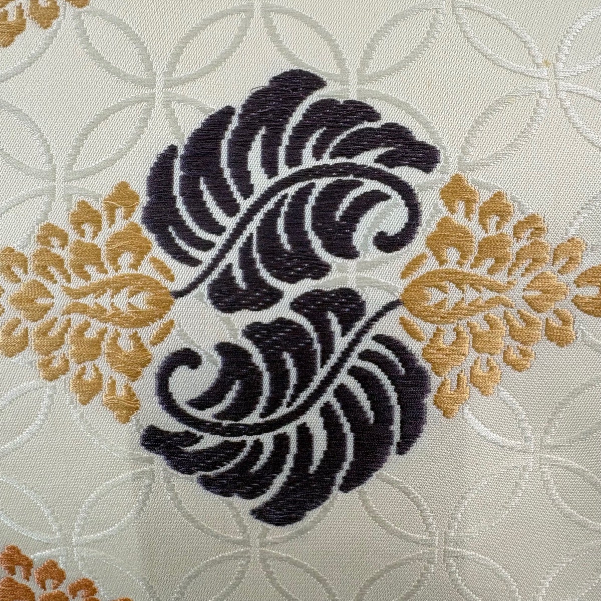 【美品】 袋帯 名品 扇 草花 刺繍 螺鈿 クリーム お太鼓柄 正絹