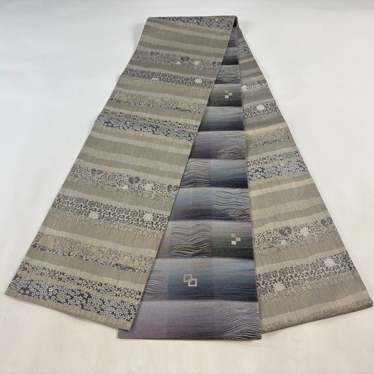 【美品】 袋帯 秀品 縞模様 金銀糸 箔 灰色 全通 正絹