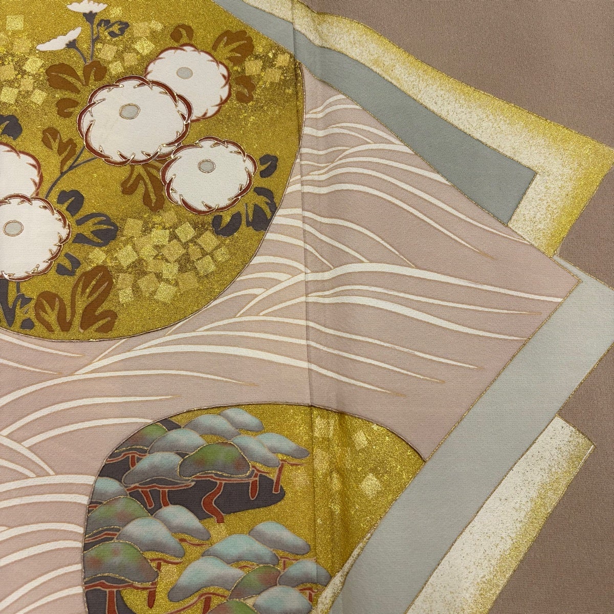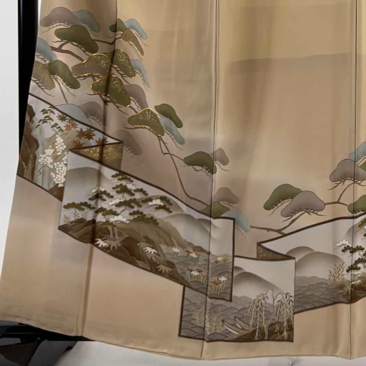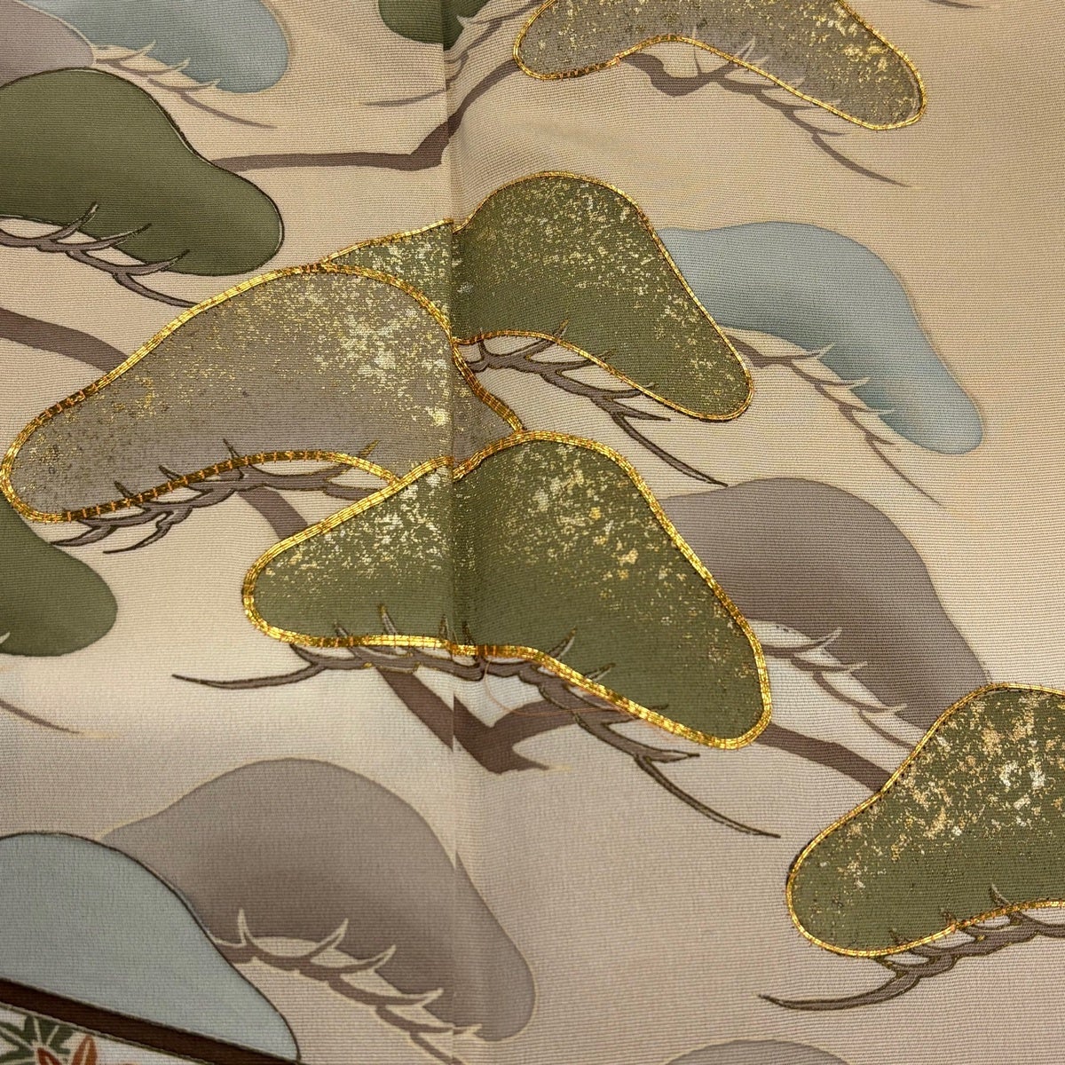 色留袖 身丈159cm 裄丈64.5cm M 袷 松 波頭 蘇州刺繍 ベージュ 正絹 秀品 三つ紋