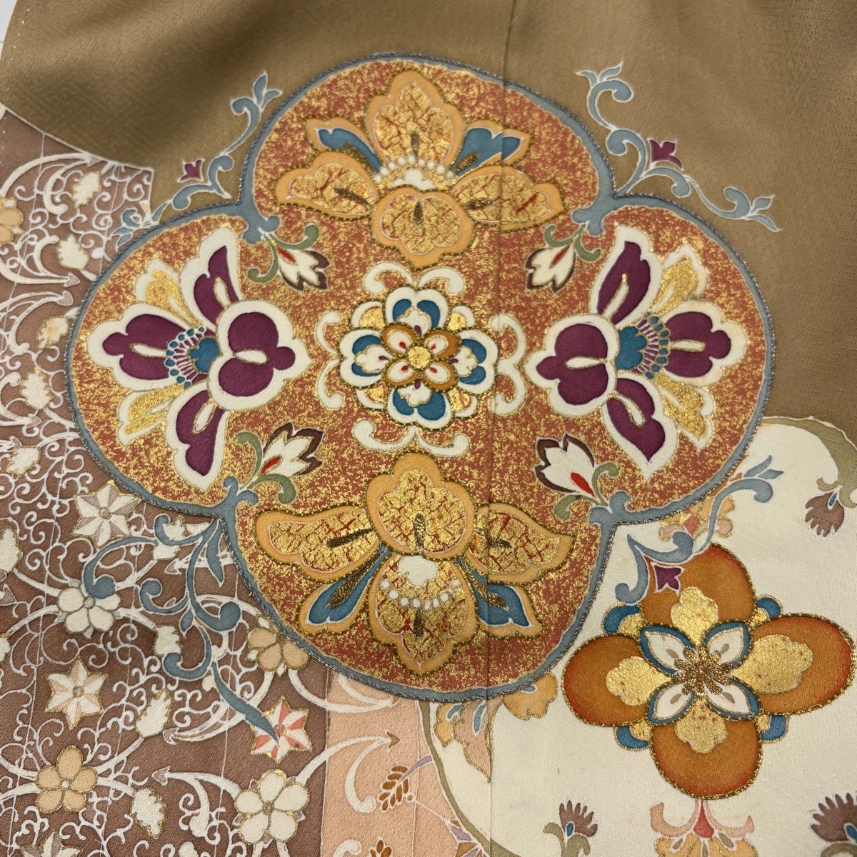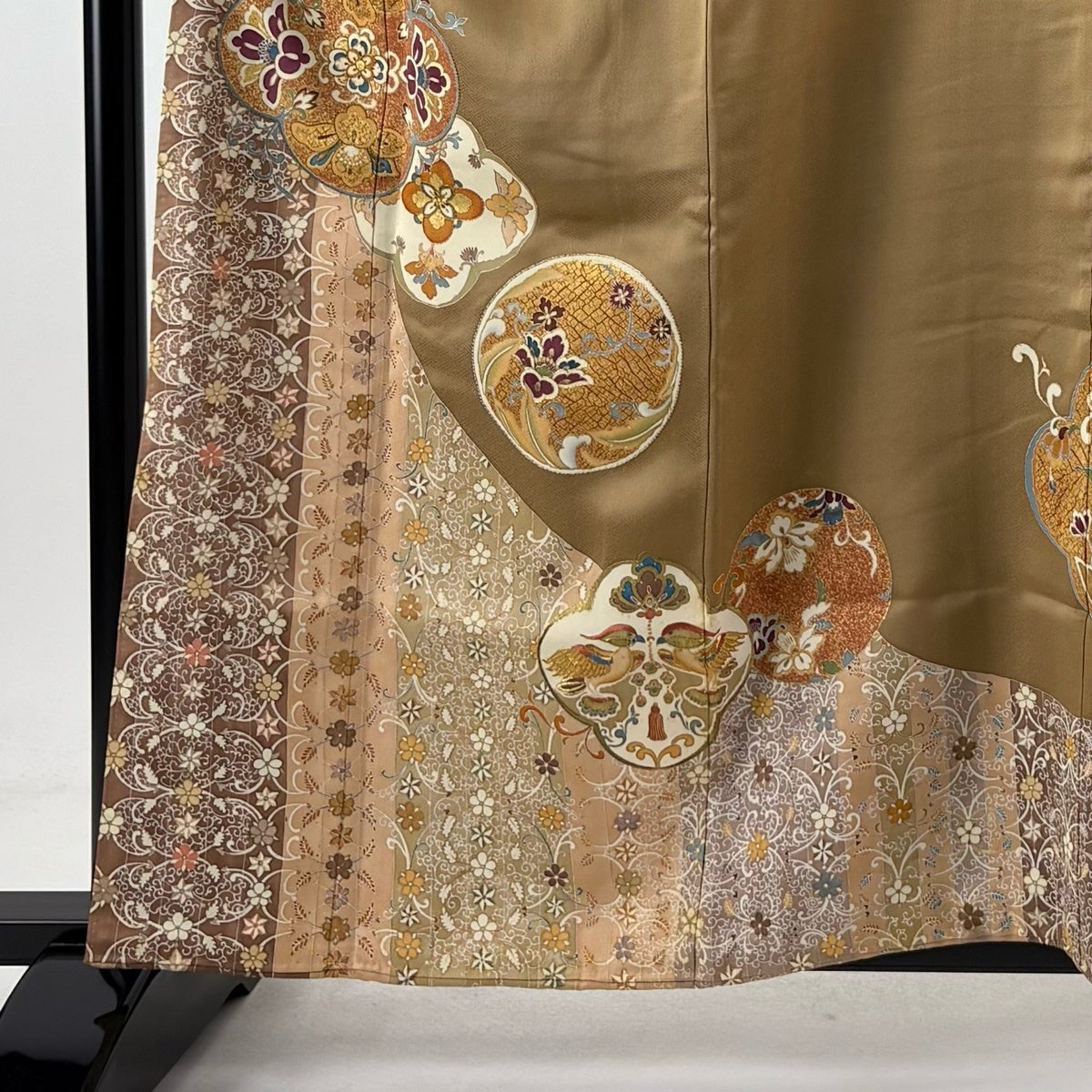 色留袖 身丈161cm 裄丈65cm M 袷 華文 向かい鳥 金糸 金彩 ベージュ 正絹 秀品 一つ紋
