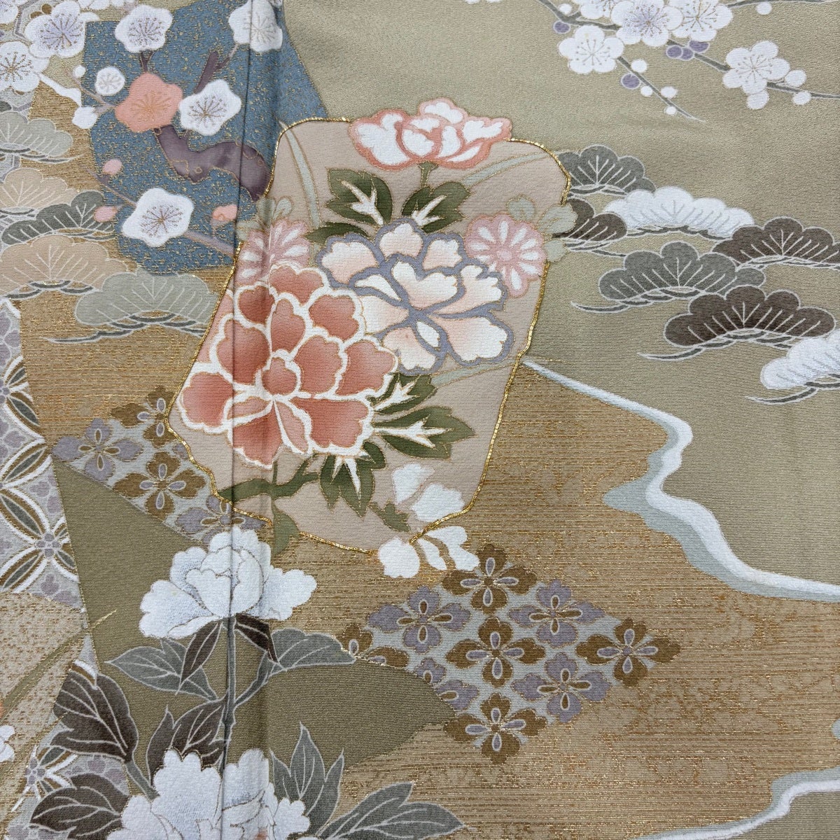 50%OFF 色留袖 身丈155cm 裄丈63.5cm S 袷 松 梅 金彩 灰緑 正絹 秀品 三つ紋 K50