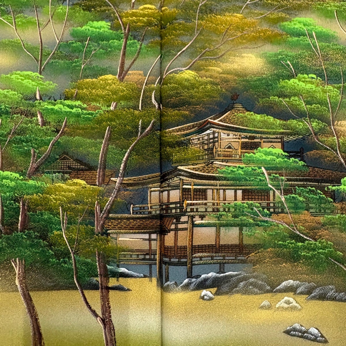 【美品】 色留袖 身丈165.5cm 裄丈67.5cm L 袷 金閣寺庭園 風景 金彩 青灰色 正絹 秀品 一つ紋