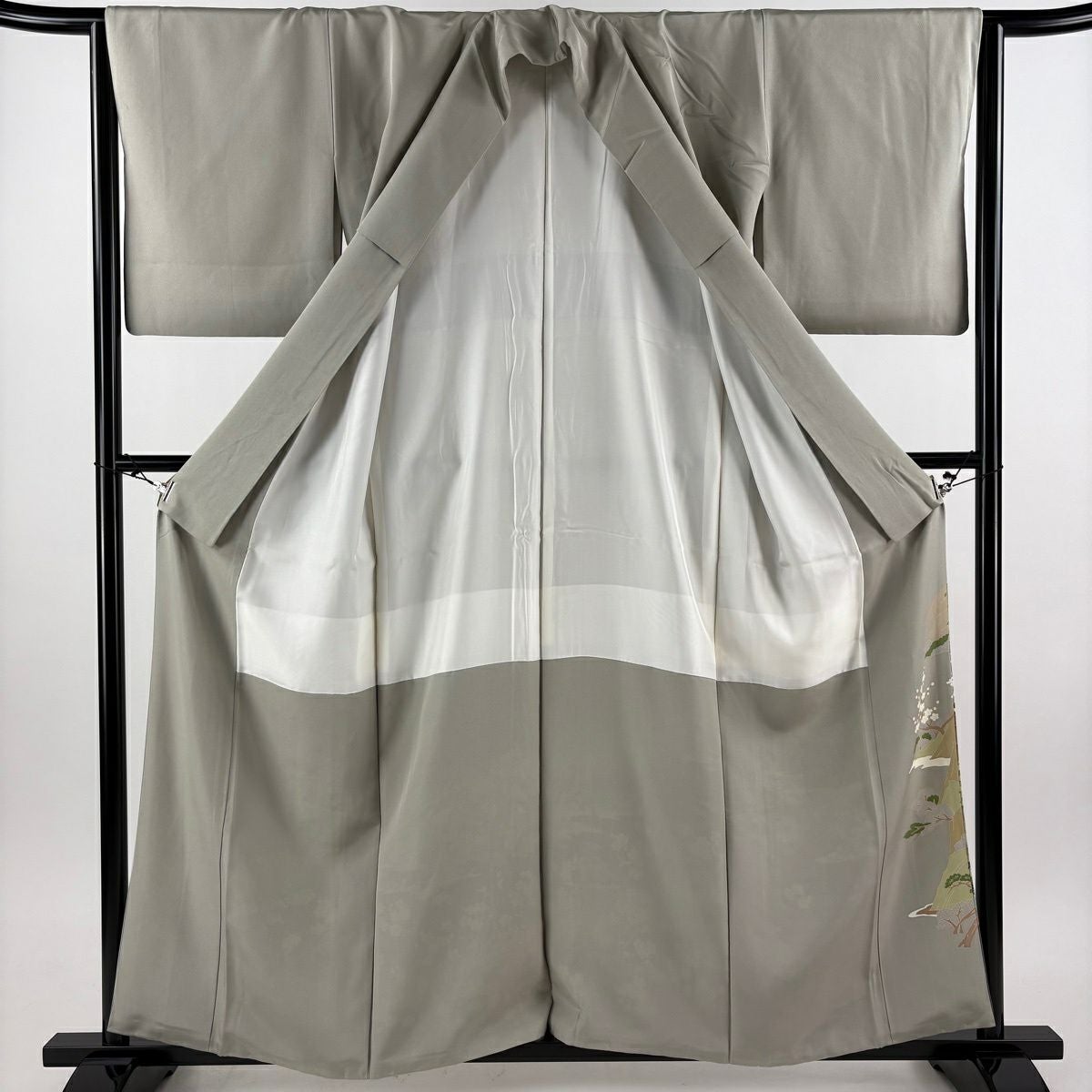 色留袖 身丈161cm 裄丈69cm L 袷 落款あり 松 人物 金彩 ぼかし 灰緑 正絹 秀品 一つ紋