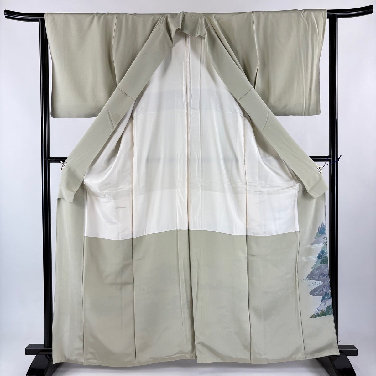 色留袖 身丈159cm 裄丈63cm S 袷 落款あり 水辺の風景 松梅 ぼかし 灰色 正絹 秀品 五つ紋