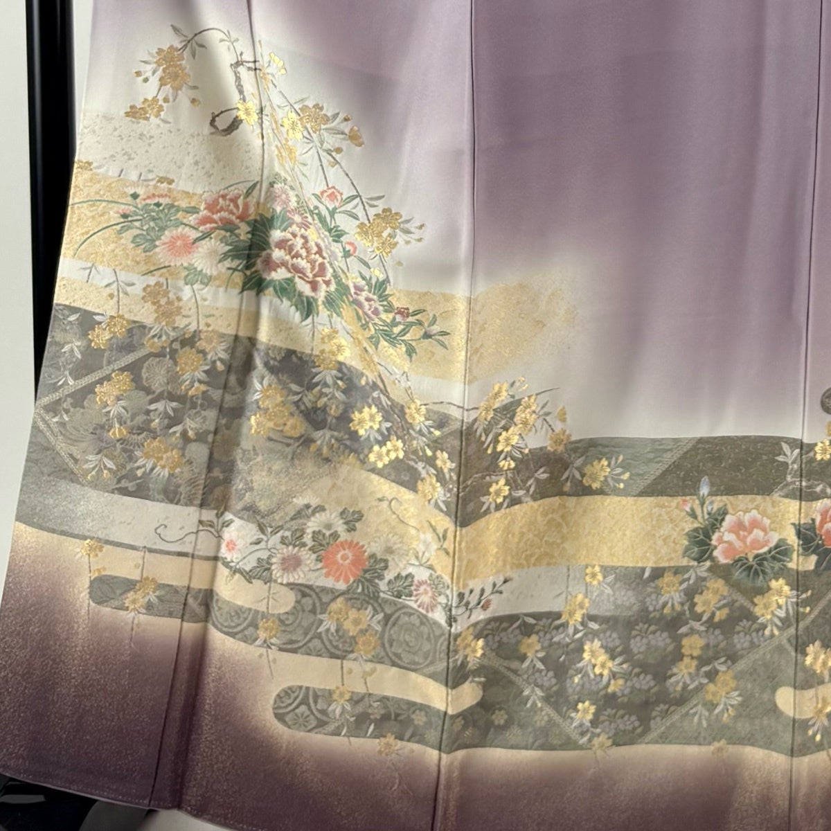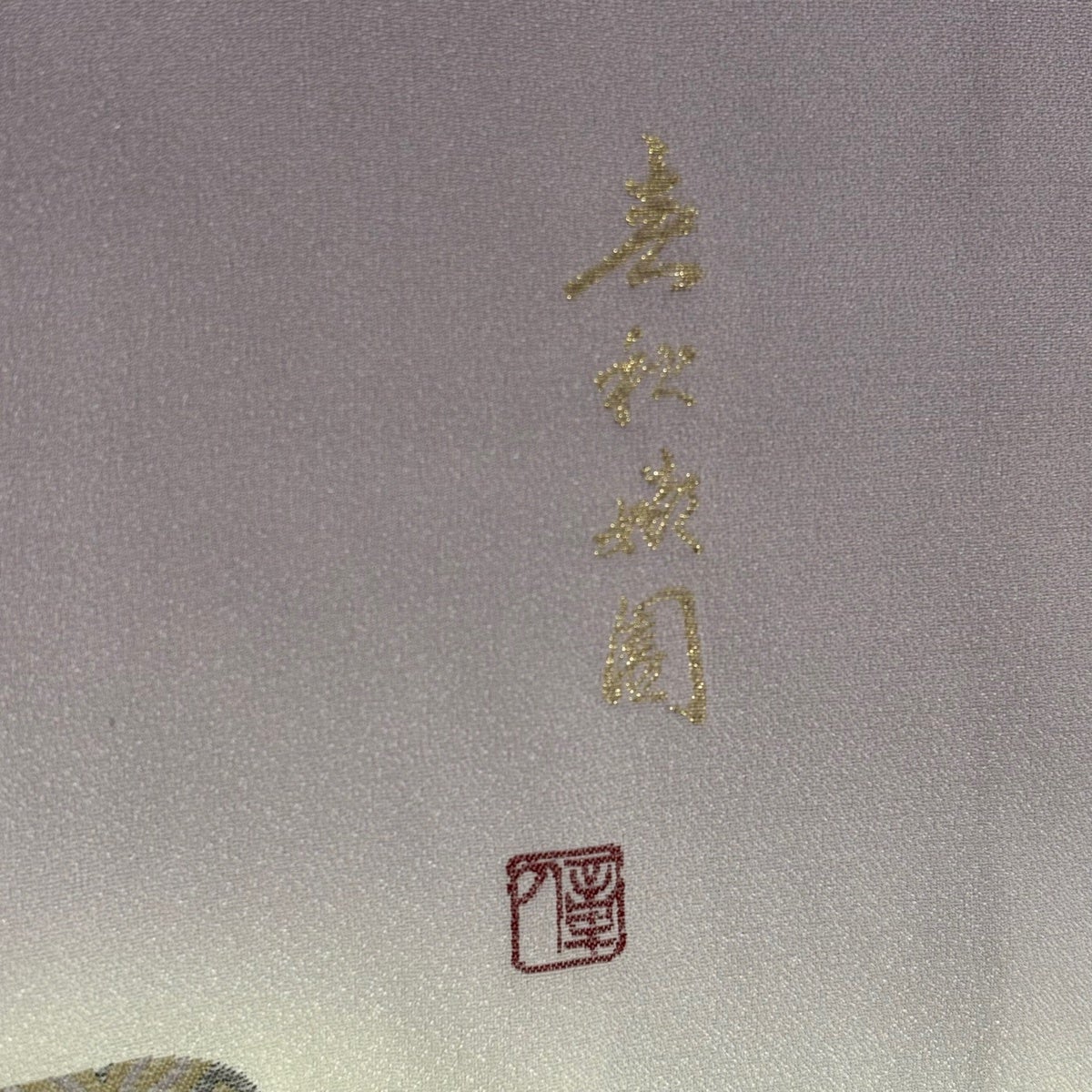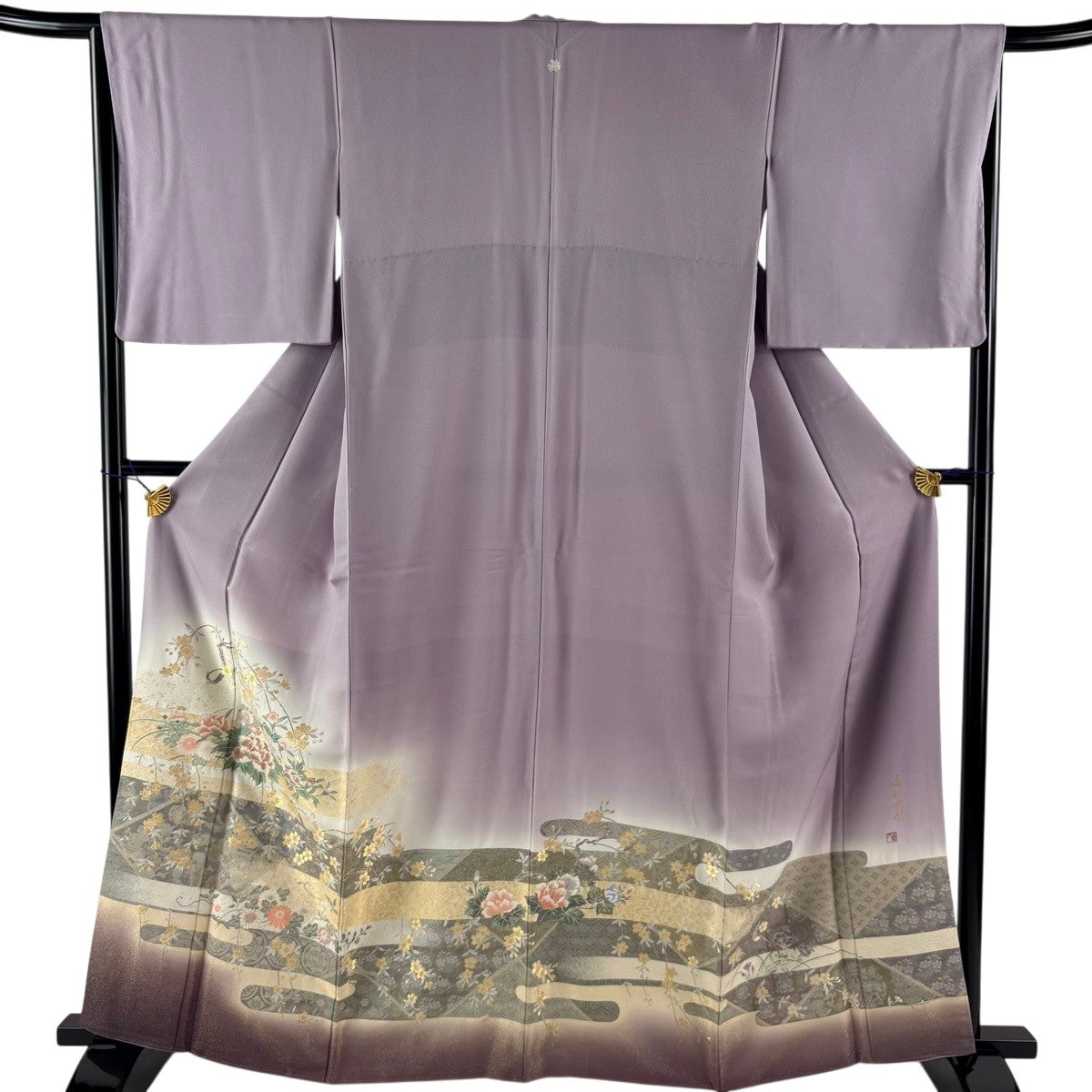 色留袖 身丈156cm 裄丈63.5cm S 袷 横山大観 落款あり 山 霞 金銀糸 ぼかし 灰紫 正絹 名品 一つ紋