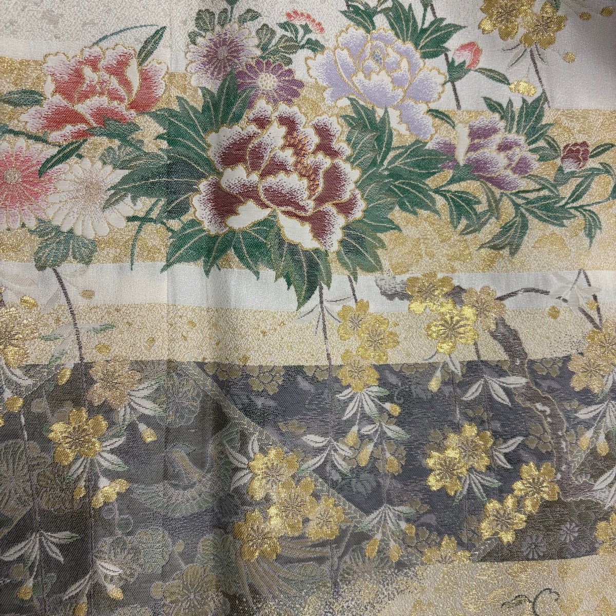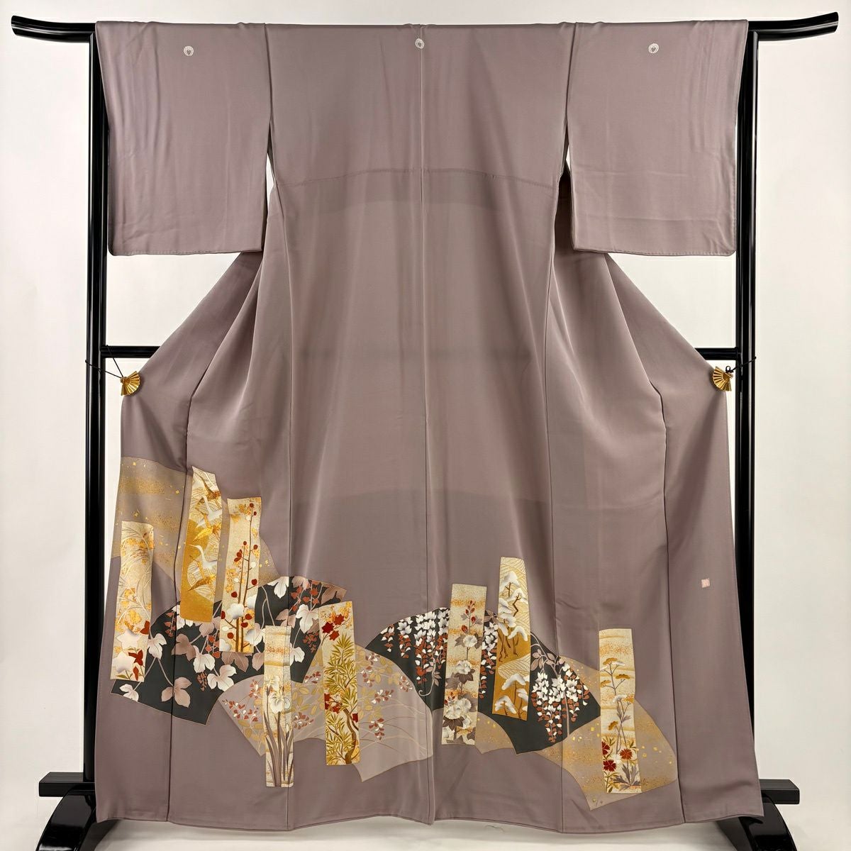 50%OFF 色留袖 身丈158.5cm 裄丈64cm M 袷 牡丹 扇面 金糸 金彩 灰色 正絹 秀品 三つ紋 K50