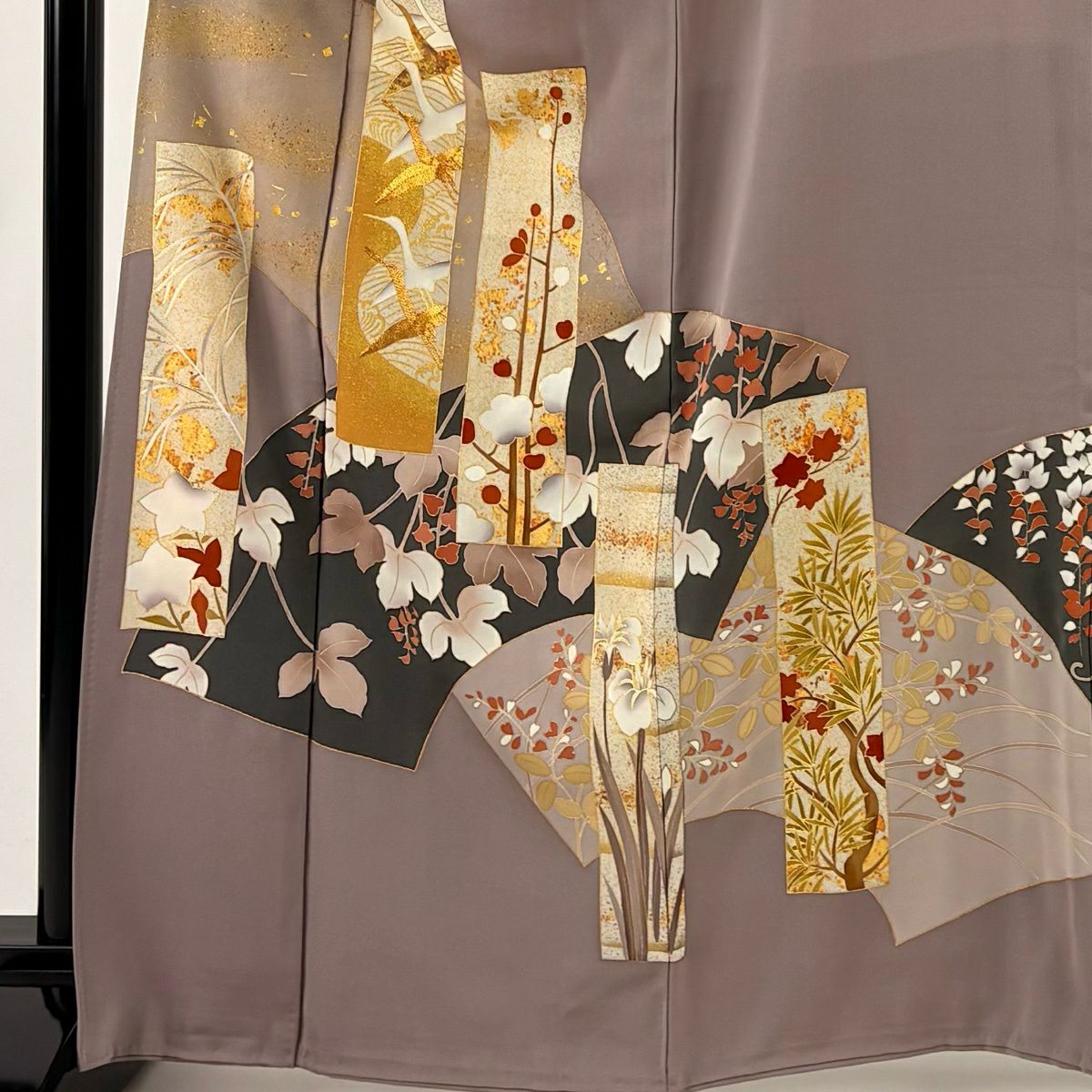 50%OFF 色留袖 身丈160.5cm 裄丈66cm M 袷 鶴 扇面 金糸 金彩 薄茶色 正絹 秀品 一つ紋 K50