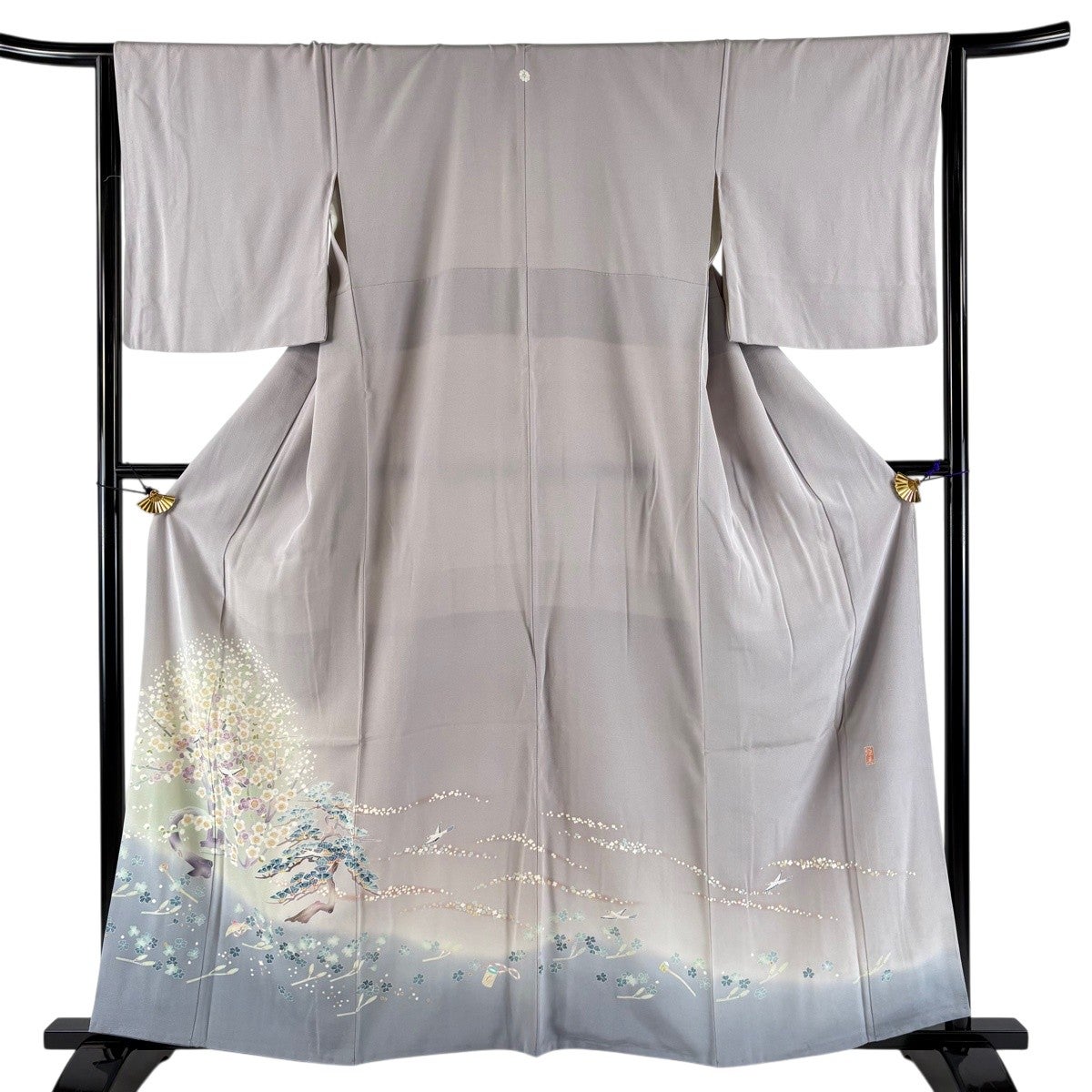 70%OFF 色留袖 身丈156.5cm 裄丈64cm M 袷 落款あり 鶴 松 青灰色 正絹 秀品 一つ紋 K70
