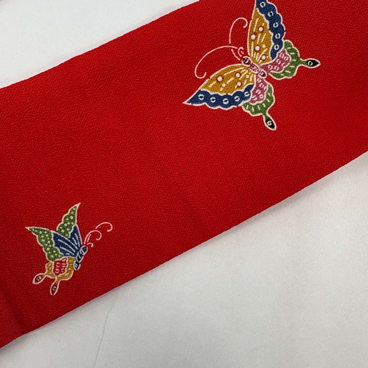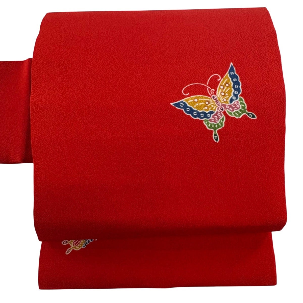 【美品】 名古屋帯 逸品 栗山吉三郎 落款あり 蝶 縮緬 茜色 正絹