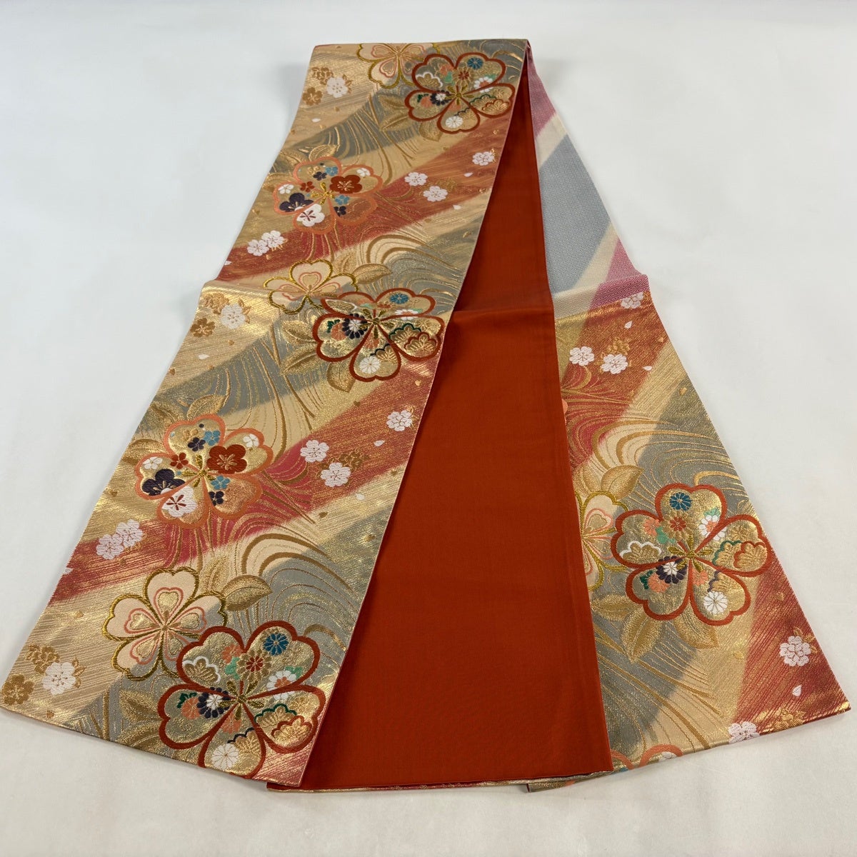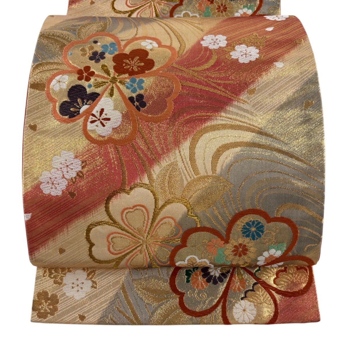 30%OFF 【美品】 袋帯 秀品 桜 流水 金糸 唐織 茜色 六通 正絹 K30