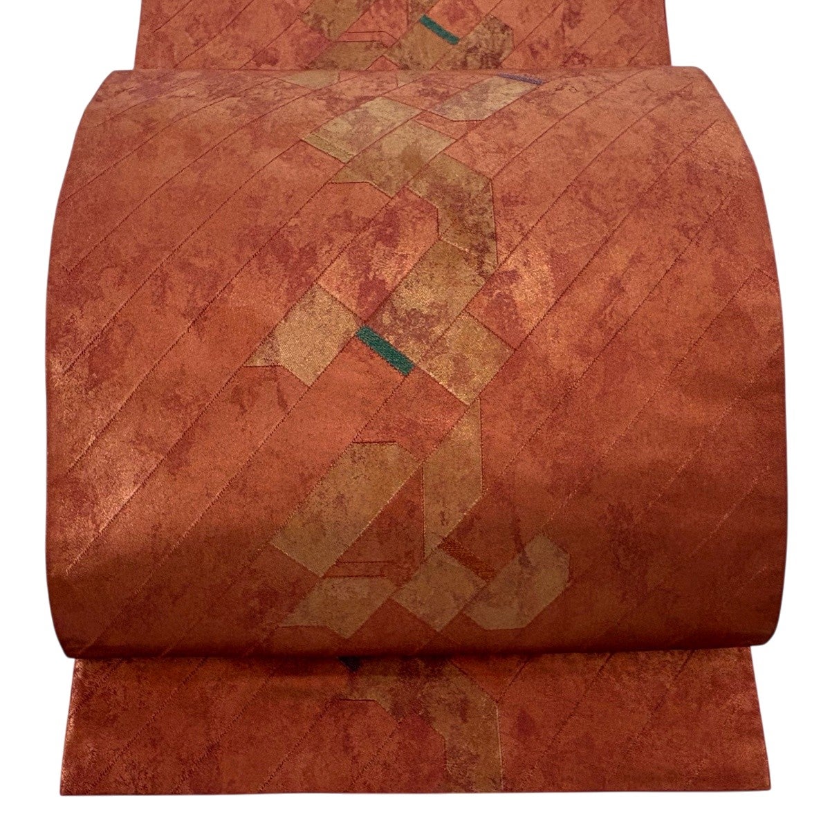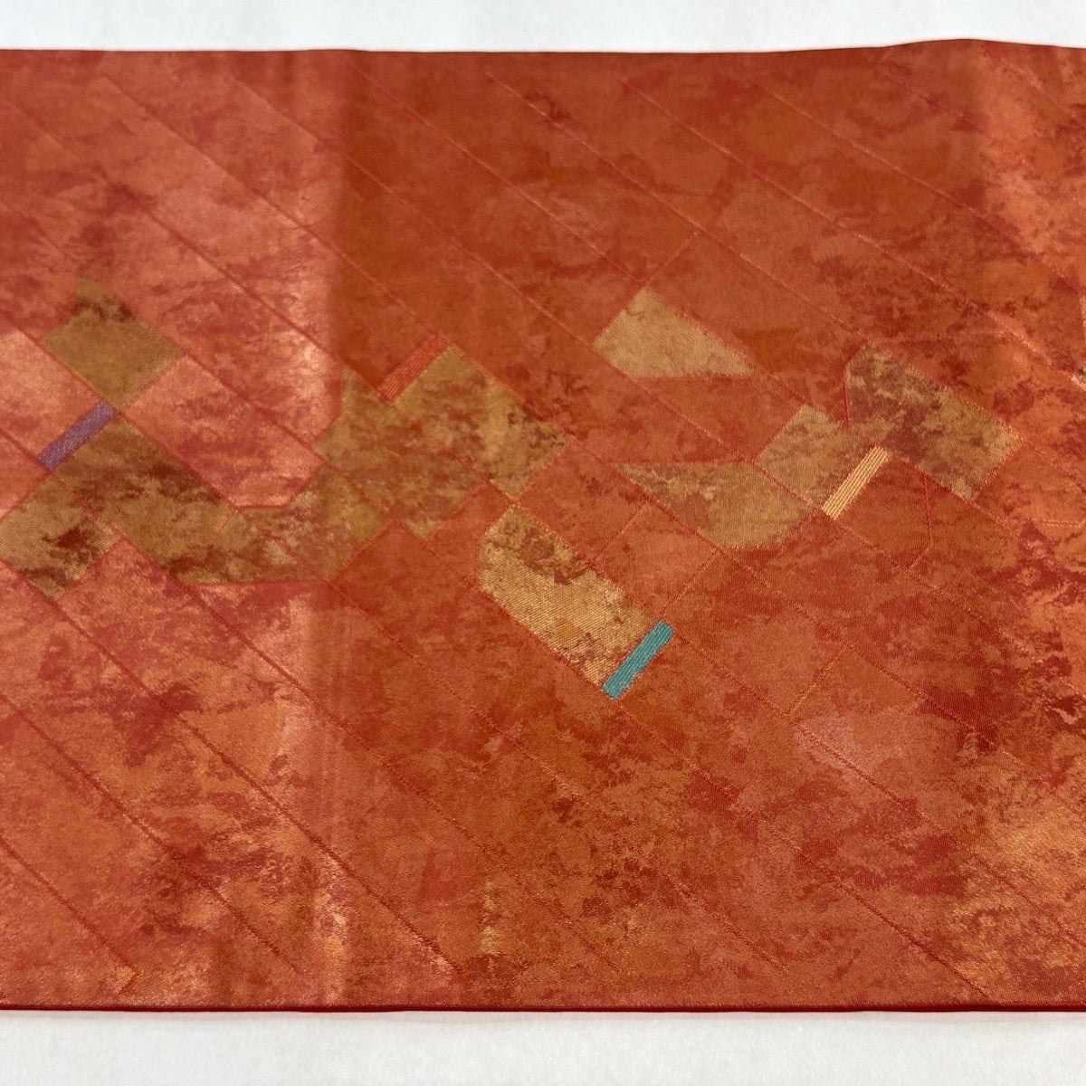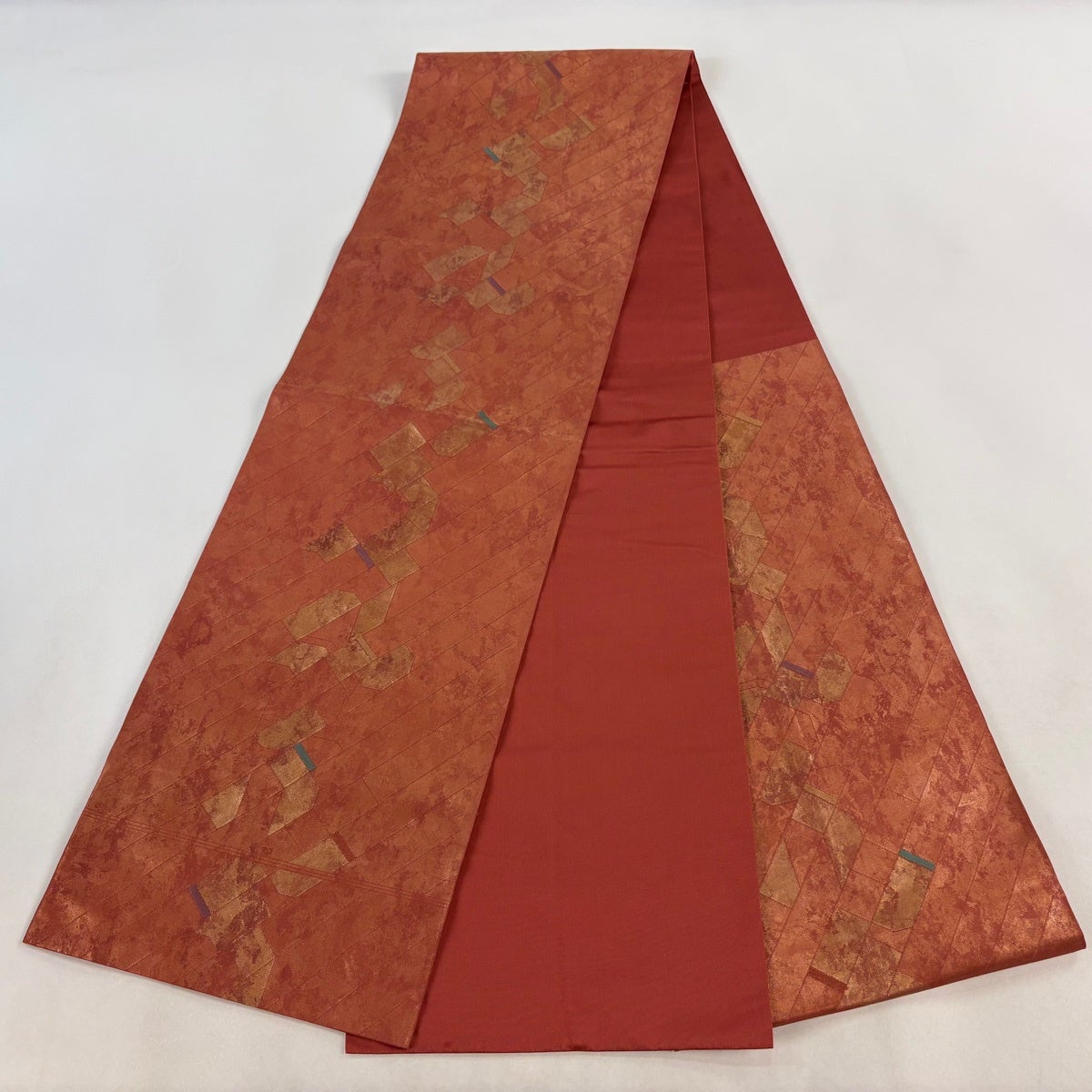 70%OFF 【美品】 袋帯 秀品 夏帯 幾何学 箔 茜色 お太鼓柄 正絹 K70