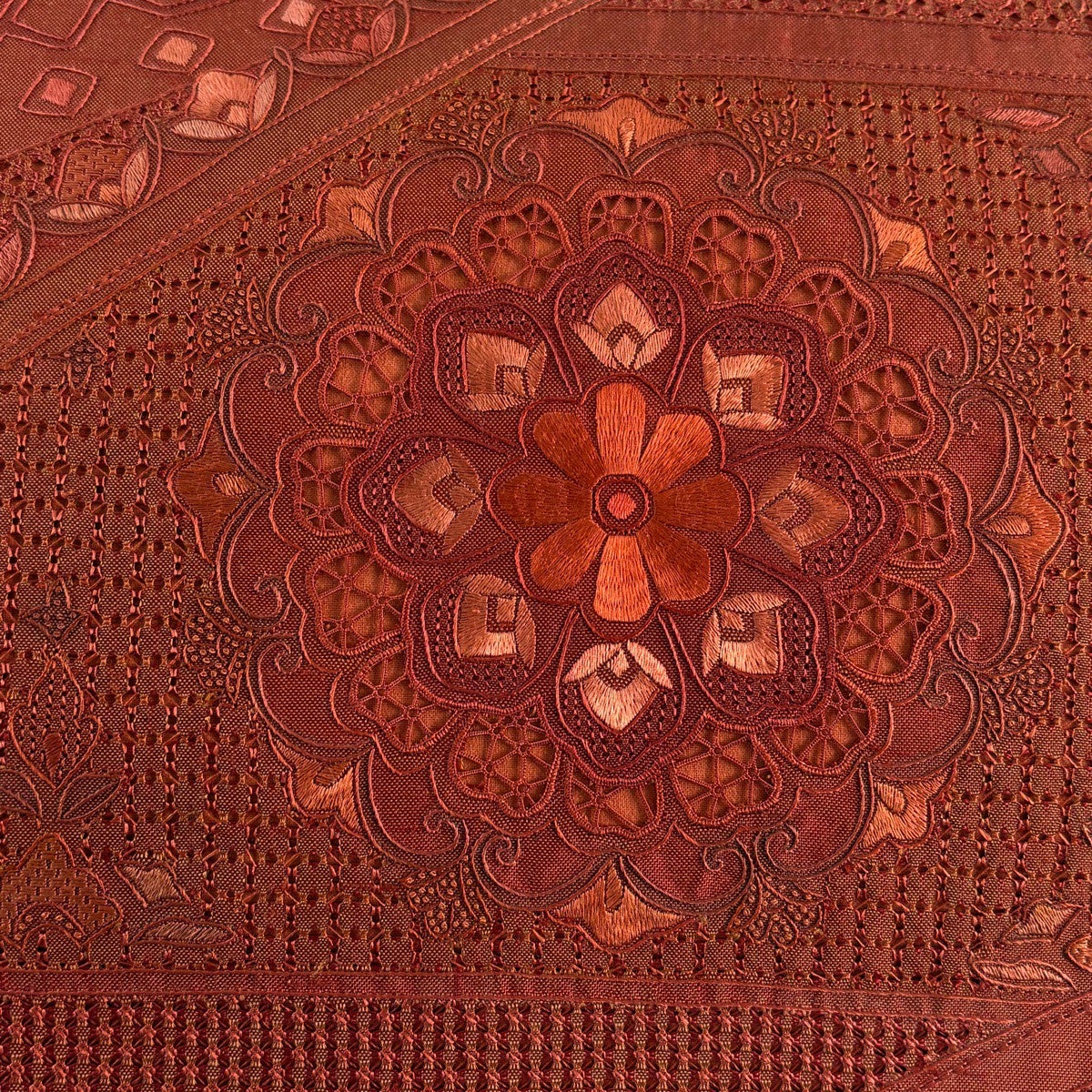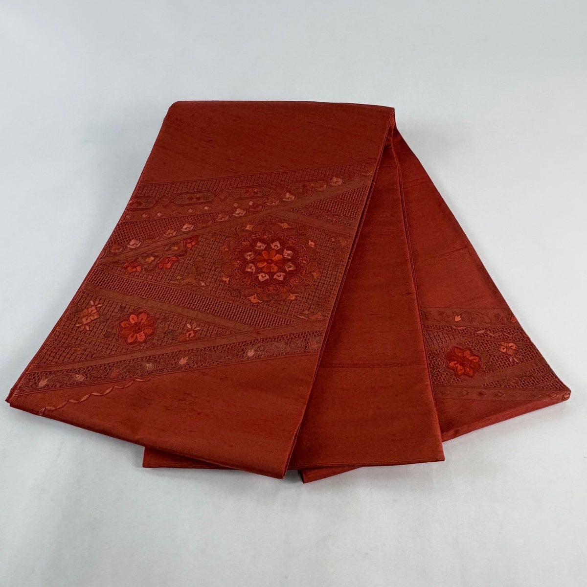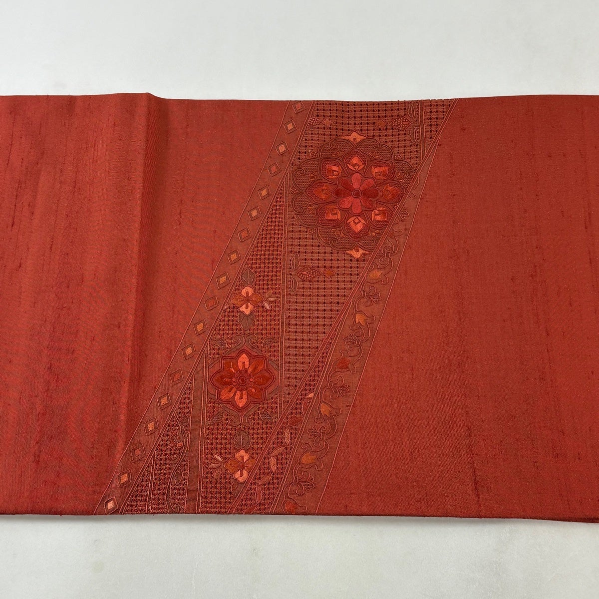 50%OFF 【美品】 袋帯 名品 紬地 草花 刺繍 茜色 お太鼓柄 正絹 K50
