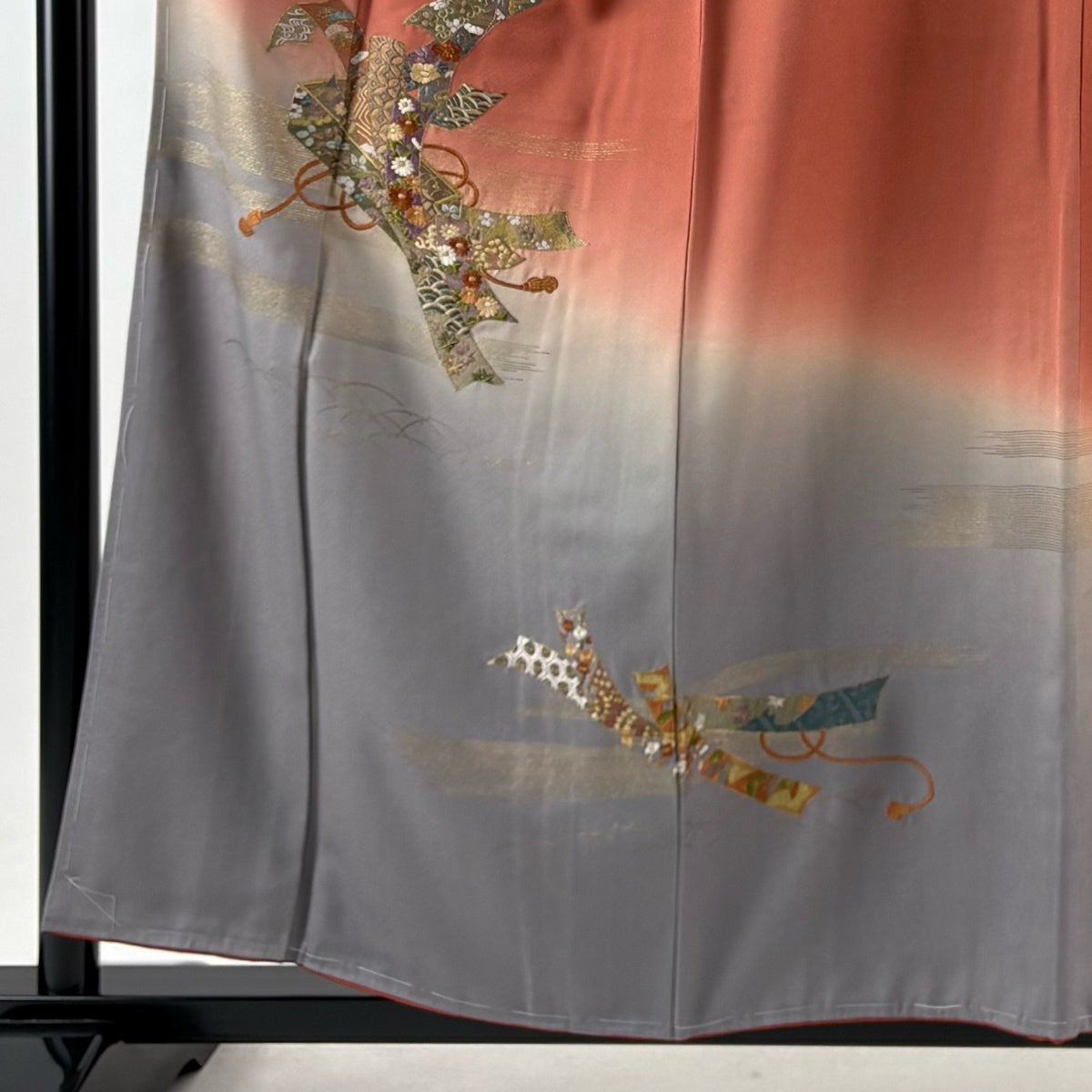 振袖 身丈162cm 裄丈65cm M 袷 雪輪 牡丹 金彩 ぼかし 茜色 正絹 秀品