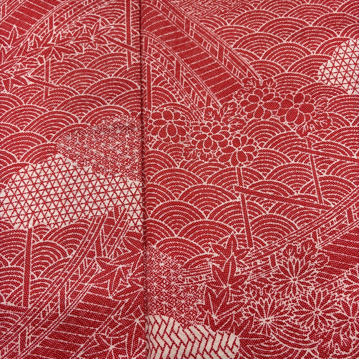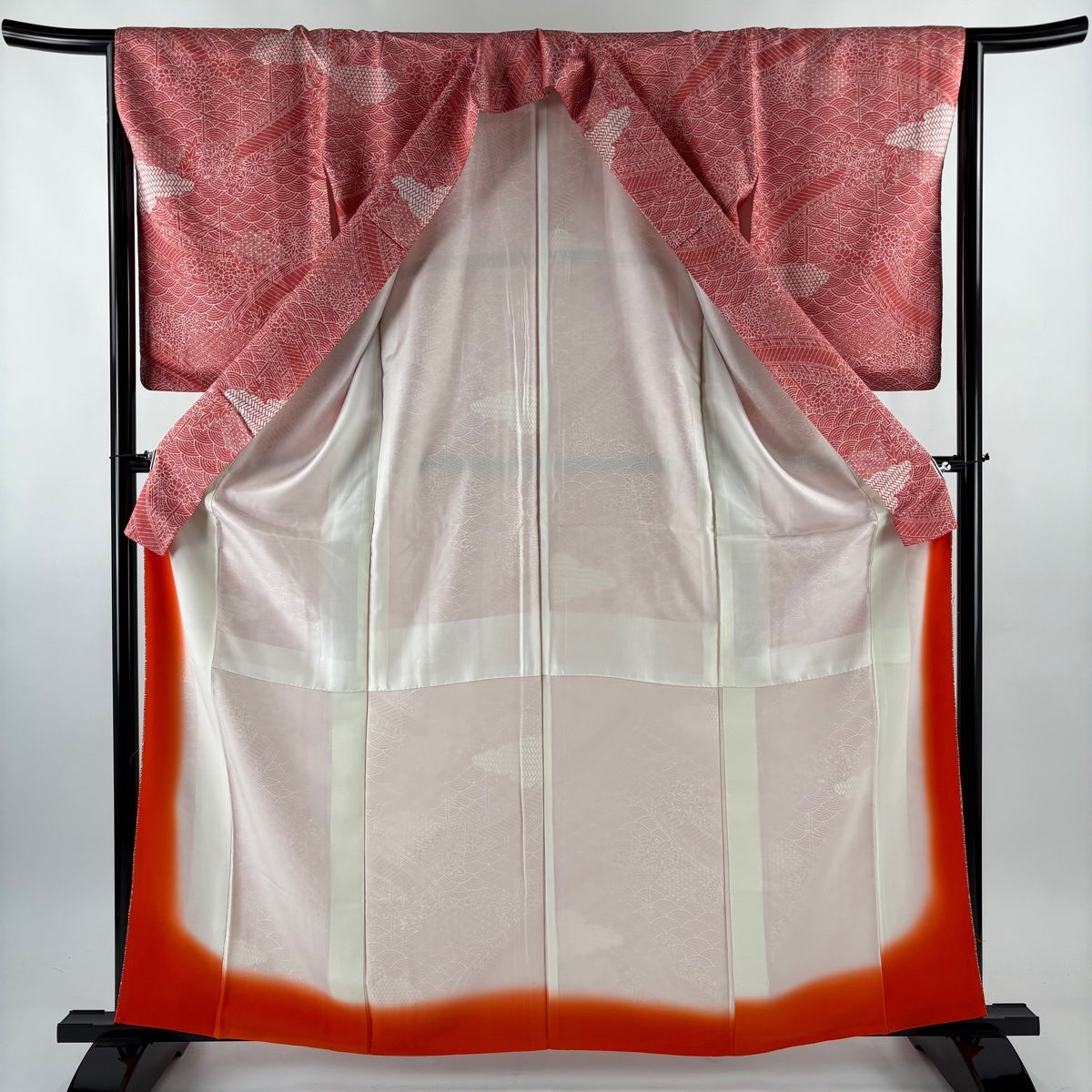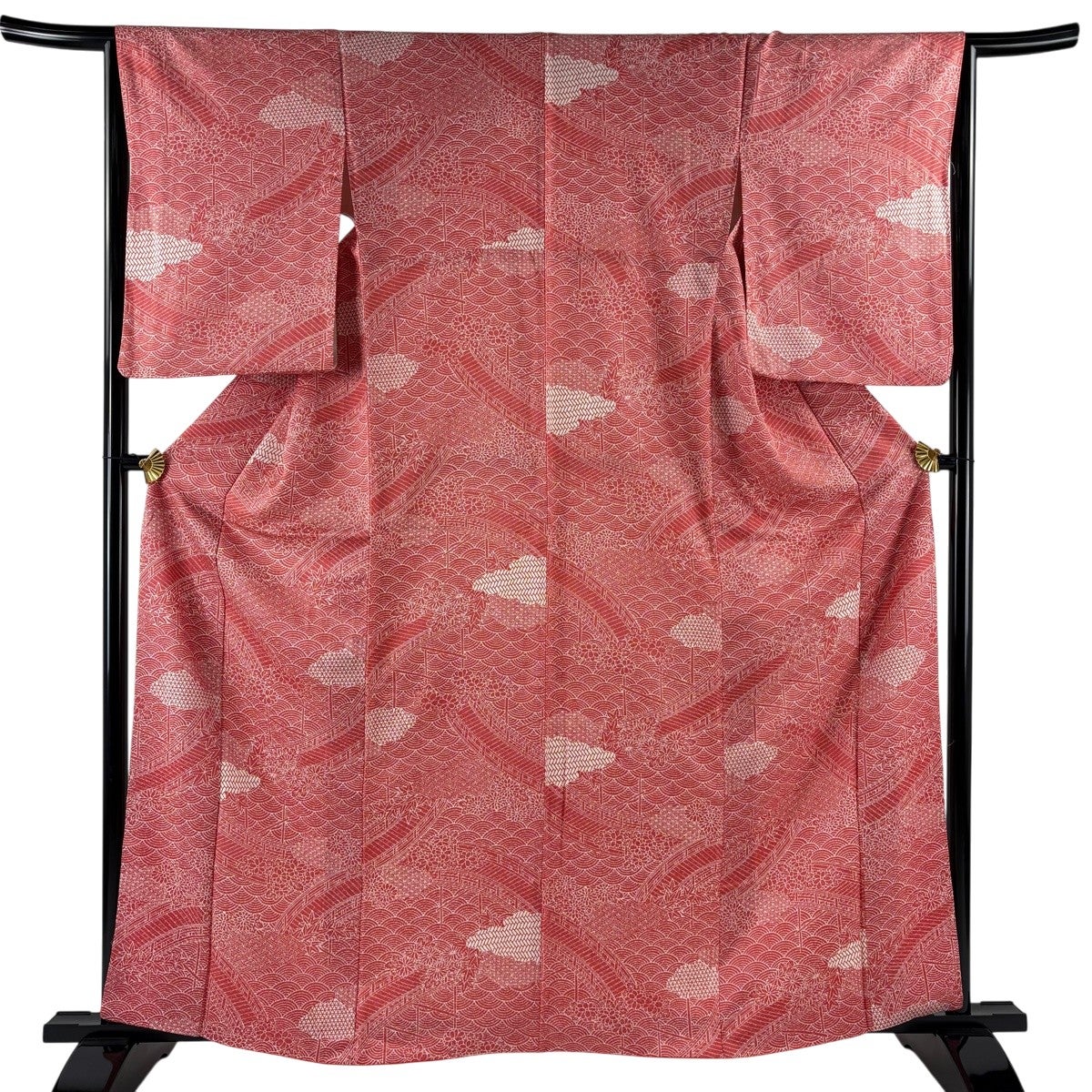【美品】 小紋 身丈162.5cm 裄丈64cm M 袷 橋 青海波 茜色 正絹 優品