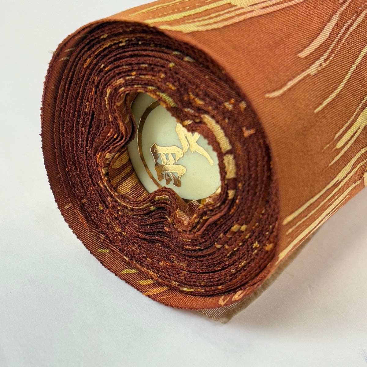 袋帯 秀品 縞 幾何学 金糸 箔 茶色 六通 正絹