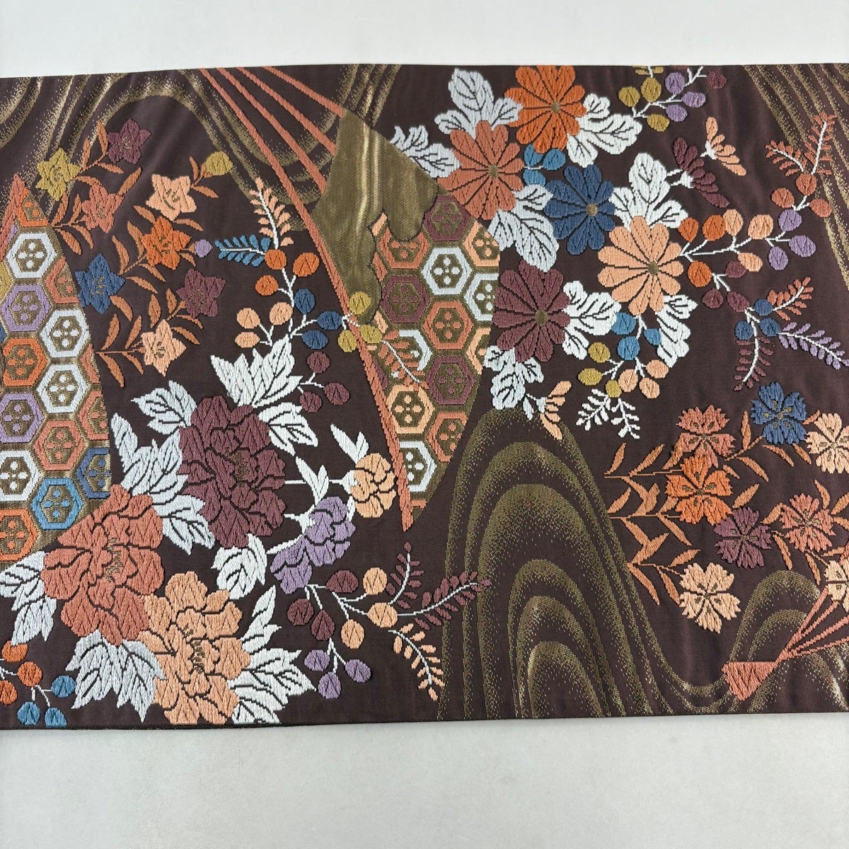50%OFF 袋帯 秀品 関西仕立て 扇 草花 唐織 箔 茶紫 六通 正絹 K50