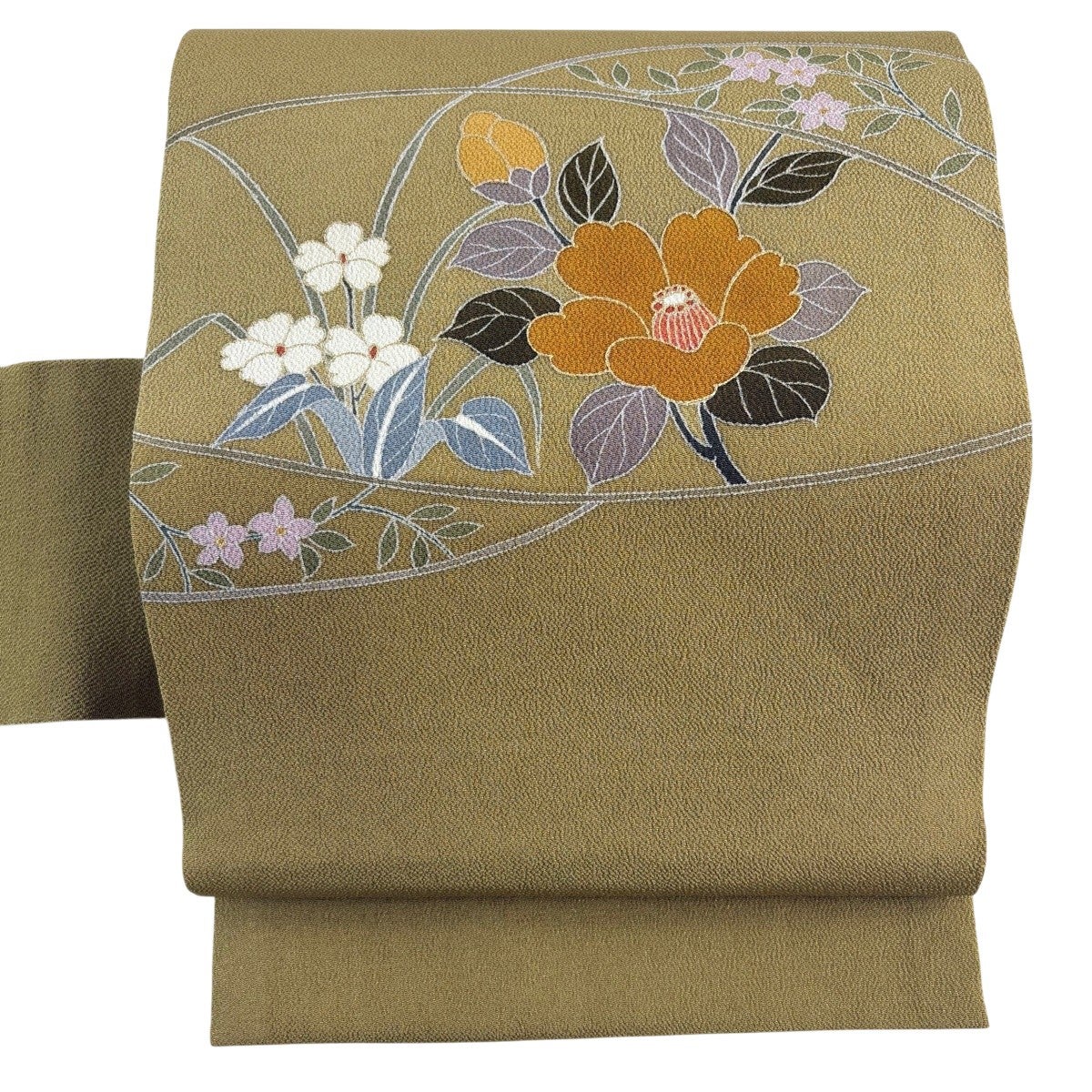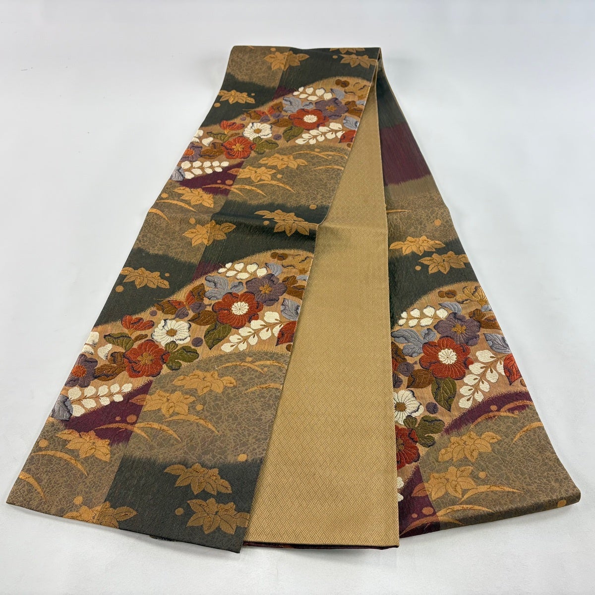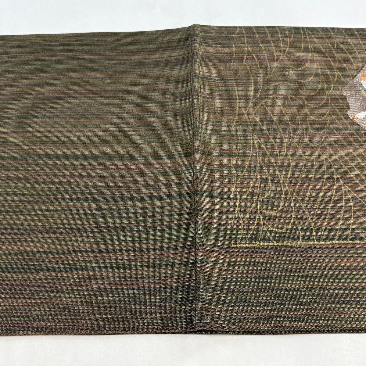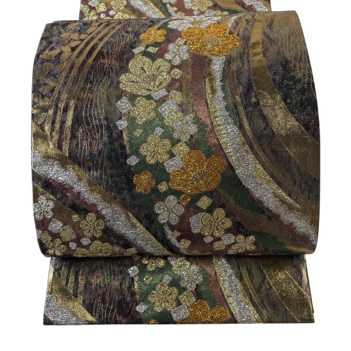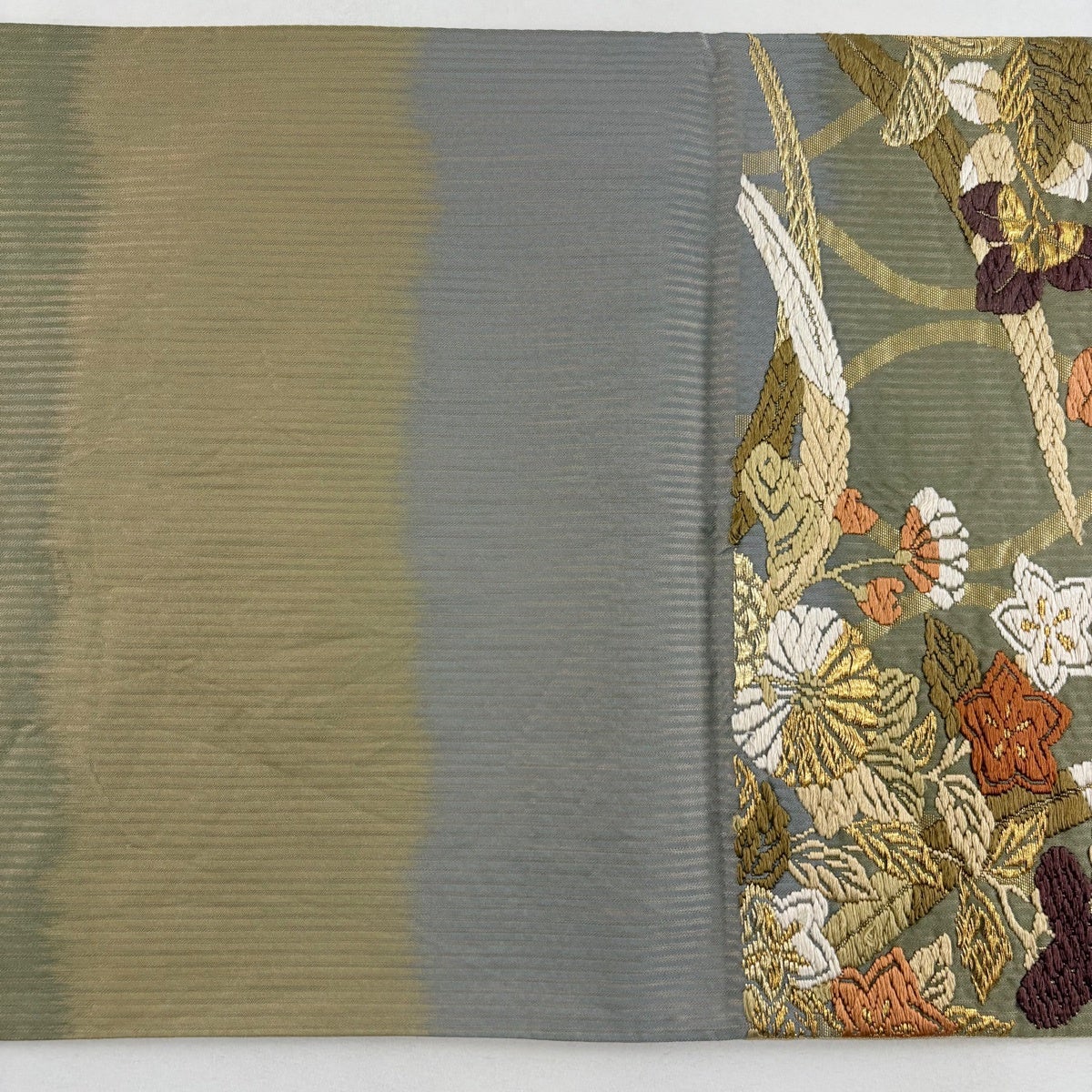 【美品】 袋帯 秀品 夏帯 草花 金糸 茶緑色 お太鼓柄 正絹
